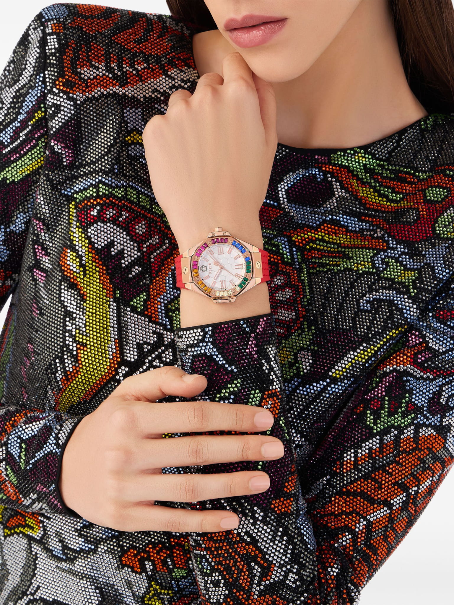 Philipp Plein Plein Lady Royal PWBDA0524 — стильные женские часы, сочетающие элегантный дизайн и функциональность. Корпус диаметром 39 мм выполнен из нержавеющей стали с розовым PVD-покрытиемPVDУльтратонкое покрытие наносится в технике вакуумного напыления, сочетает в себе нитрид титана особой прочности со слоем золота или оксида хрома. Несёт в себе декоративную или защитную функцию., что придаёт часам роскошный вид. Минеральное стеклоМинеральное стеклоМинеральное стекло представляет собой искусственно выращенный минерал кварца. Такое стекло отличается особой устойчивостью к повреждениям и царапинам. Уступает по некоторым качествам сапфировому стеклу. защищает циферблат от царапин, сохраняя его безупречный внешний вид. Циферблат инкрустирован кристаллами. Серебристый циферблат с шестиугольной текстурой подчёркивает фирменный стиль бренда. Часы оснащены кварцевым механизмом, который гарантирует точность хода. Водозащита до 5 ATM (50 метров) делает часы подходящими для повседневного использования. Ремешок из красного силикона обеспечивает комфортное ношение и надёжную фиксацию благодаря классической застёжке. Ширина ремешка 16 мм гармонично дополняет корпус, завершая стильный и современный образ.