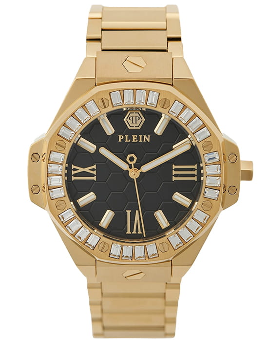 Philipp Plein Plein Lady Royal PWBDA0824 — это стильные женские часы, сочетающие современный дизайн и функциональность. Корпус диаметром 39 мм выполнен из нержавеющей стали с золотистым PVD-покрытиемPVDУльтратонкое покрытие наносится в технике вакуумного напыления, сочетает в себе нитрид титана особой прочности со слоем золота или оксида хрома. Несёт в себе декоративную или защитную функцию., что придаёт часам элегантный и роскошный вид. Минеральное стеклоМинеральное стеклоМинеральное стекло представляет собой искусственно выращенный минерал кварца. Такое стекло отличается особой устойчивостью к повреждениям и царапинам. Уступает по некоторым качествам сапфировому стеклу. защищает циферблат от царапин, сохраняя его внешний вид. Циферблат инкрустирован кристаллами. Чёрный циферблат с шестиугольной текстурой подчёркивает уникальный стиль бренда. Часовые метки в виде штрихов и классические стрелки обеспечивают удобное считывание времени. Часы оснащены кварцевым механизмом, который гарантирует точность хода. Водозащита до 5 ATM (50 метров) делает их идеальными для повседневного использования. Браслет из нержавеющей стали с золотистым PVD-покрытиемPVDУльтратонкое покрытие наносится в технике вакуумного напыления, сочетает в себе нитрид титана особой прочности со слоем золота или оксида хрома. Несёт в себе декоративную или защитную функцию. гармонично дополняет корпус на застёжке-бабочке с кнопкамиЗастёжка "бабочка"Такой вид застёжки дополняется предохранителями, помогающими избежать случайного раскрытия браслета. Обладают изящным исполнением. обеспечивает удобство и надёжность при ношении. Ширина браслета 16 мм завершает утончённый образ.