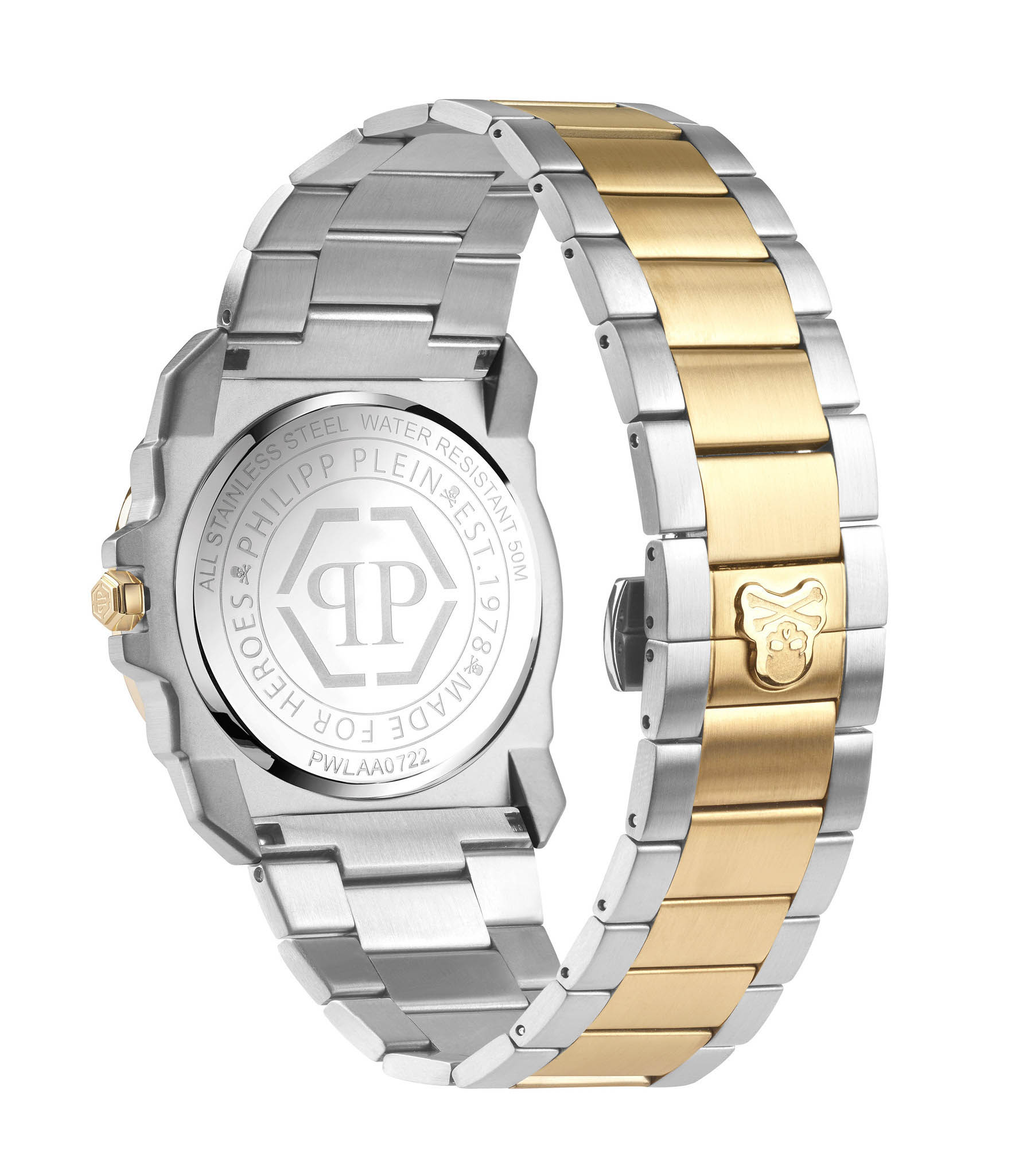 Мужские кварцевые часы с фирменным изображением черепа Philipp Plein The Skull King PWLAA0722, кварцевый механизм с высокой точностью. Класс водозащиты: 50 метров, позволит защитить корпус от случайных брызг или капель дождя. Корпус и браслет часов изготовлены из стали с частичным IP-покрытиемIP-покрытиеМетод ионного напыления. Демонстрирует повышенную устойчивость к истиранию, окислению и химическим веществам. Под воздействием высокого давления и температуры около 1500°C молекулы металла надёжно соединяются с частицами корпуса часов. цвета желтое золото. Прочное минеральное стеклоМинеральное стеклоМинеральное стекло представляет собой искусственно выращенный минерал кварца. Такое стекло отличается особой устойчивостью к повреждениям и царапинам. Уступает по некоторым качествам сапфировому стеклу. устойчивое к мелким механическим повреждениям. Браслет дополняет застёжка-бабочка с кнопкамиЗастёжка "бабочка"Такой вид застёжки дополняется предохранителями, помогающими избежать случайного раскрытия браслета. Обладают изящным исполнением. .