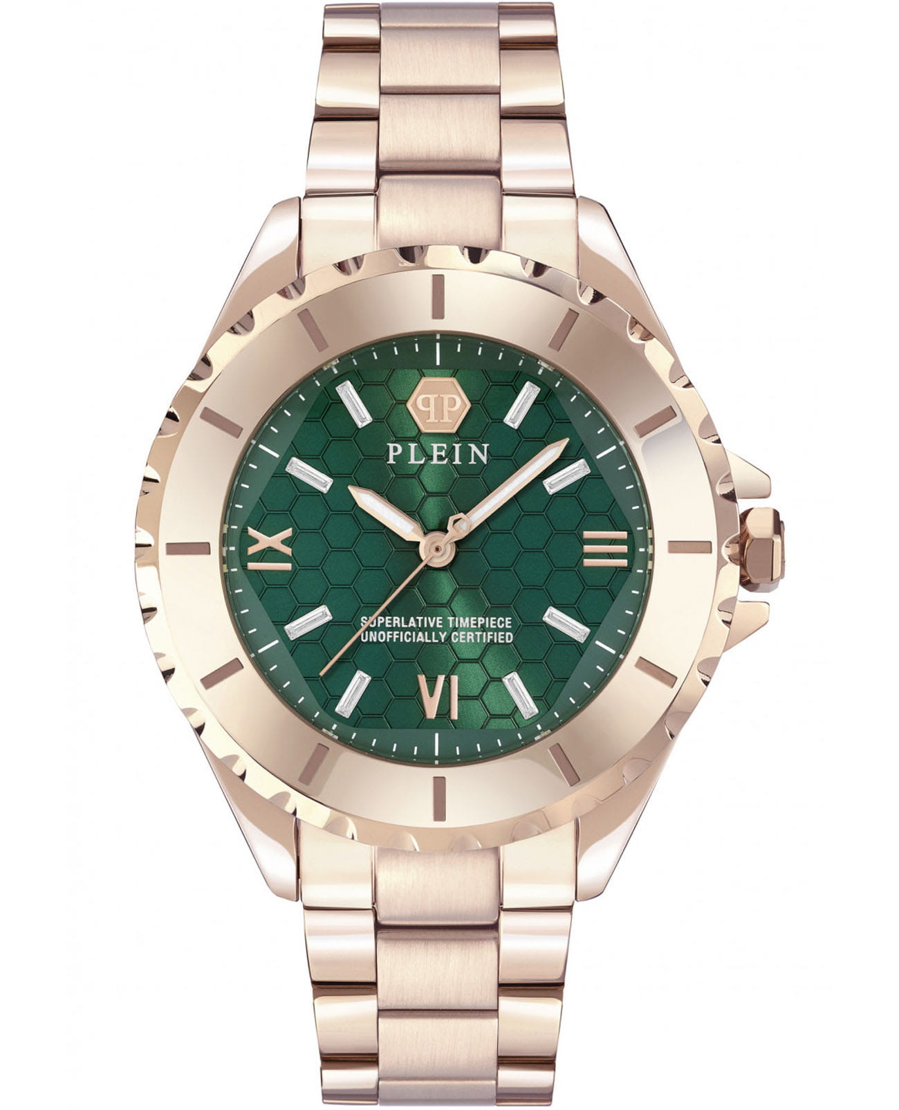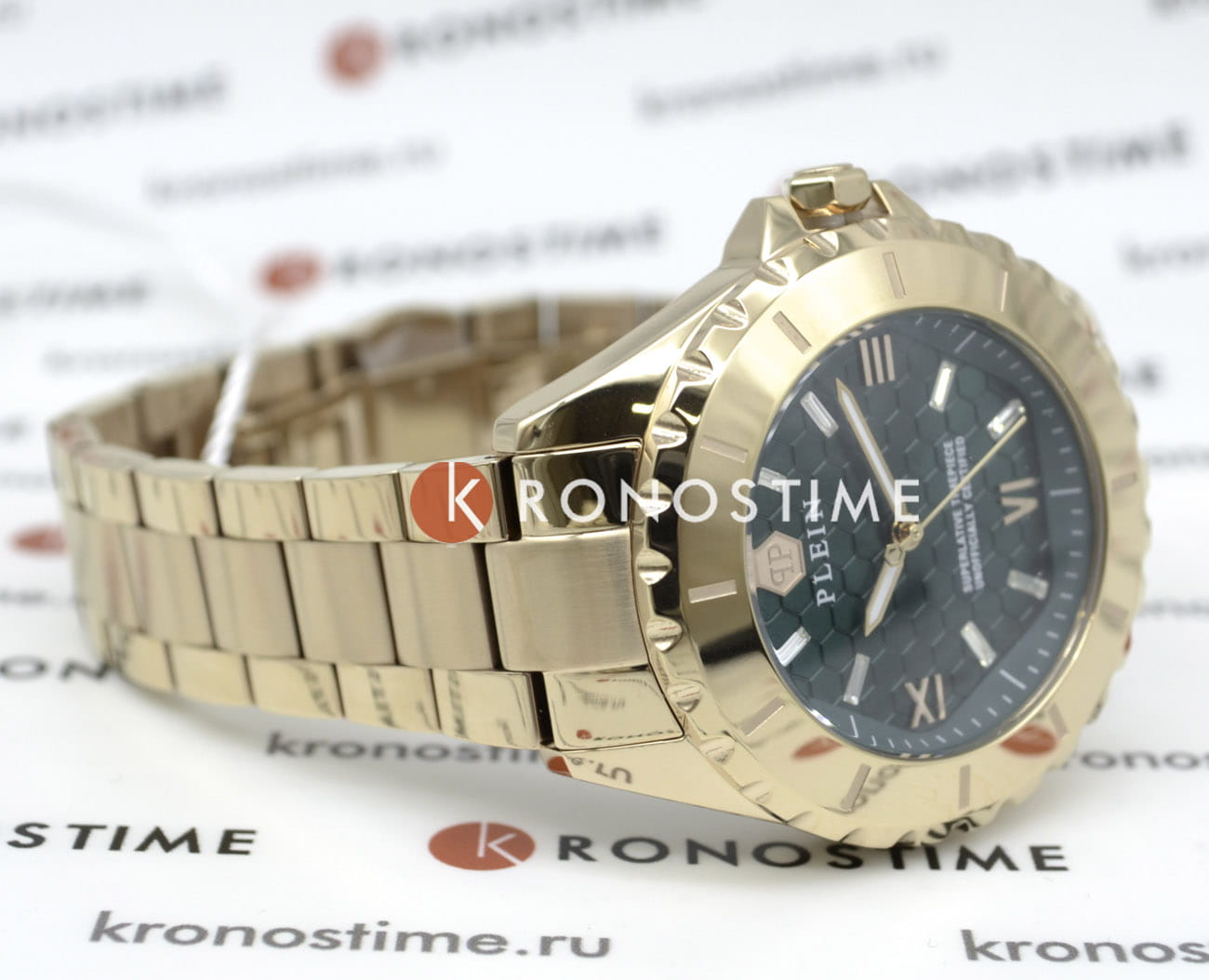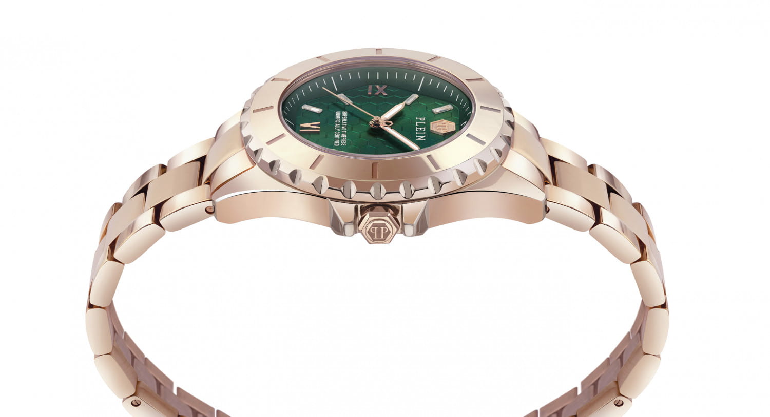 Часы Philipp Plein PWPOA0824 из коллекции Heaven сочетают элегантность и функциональность. Корпус диаметром 38 мм выполнен из нержавеющей стали с IP-покрытиемIP-покрытиеМетод ионного напыления. Демонстрирует повышенную устойчивость к истиранию, окислению и химическим веществам. Под воздействием высокого давления и температуры около 1500°C молекулы металла надёжно соединяются с частицами корпуса часов., придающим изделию роскошный вид. Зеленый циферблат украшен фирменным логотипом бренда в виде черепа на отметке 12 часов.