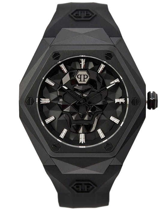 Philipp Plein The Skull Spikes PWPWA0324 — мужские кварцевые часы с выразительным дизайном и функциональностью. Корпус диаметром 45 мм выполнен из нержавеющей стали с чёрным PVD-покрытиемPVDУльтратонкое покрытие наносится в технике вакуумного напыления, сочетает в себе нитрид титана особой прочности со слоем золота или оксида хрома. Несёт в себе декоративную или защитную функцию., что обеспечивает стильный внешний вид и долговечность. Минеральное стеклоМинеральное стеклоМинеральное стекло представляет собой искусственно выращенный минерал кварца. Такое стекло отличается особой устойчивостью к повреждениям и царапинам. Уступает по некоторым качествам сапфировому стеклу. защищает циферблат от царапин и повреждений. Чёрный циферблат с изображением черепа подчёркивает дерзкий дух бренда. Чёткие стрелки и индексы обеспечивают удобство считывания времени. Часы оснащены кварцевым механизмом, гарантирующим точность хода. Ремешок выполнен из чёрного силикона, что обеспечивает комфортное прилегание к запястью. Классическая застёжка гарантирует надёжную фиксацию. Водозащита до 5 ATM (50 метров) делает часы подходящими для повседневного использования. Philipp Plein The Skull Spikes PWPWA0324 — это смелый аксессуар для мужчин, которые ценят индивидуальность и стиль.