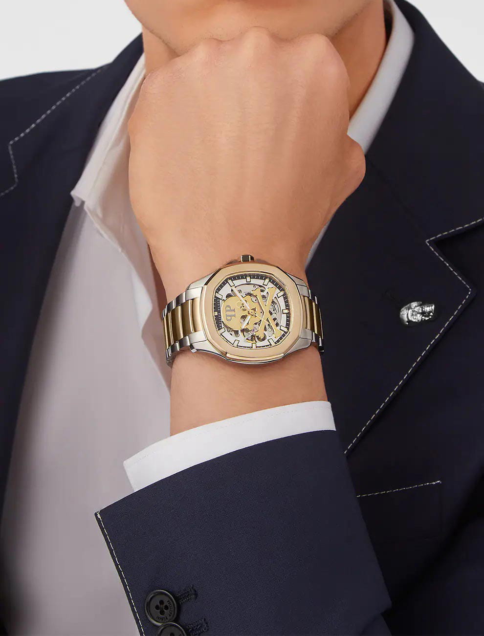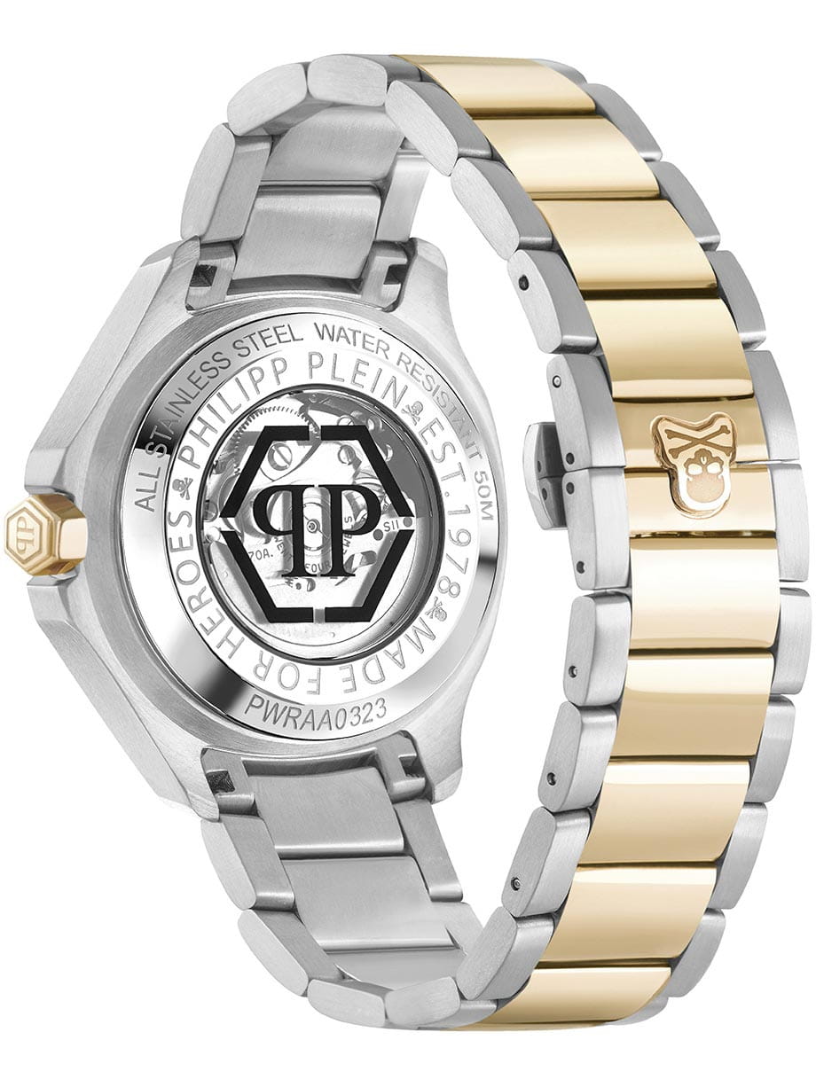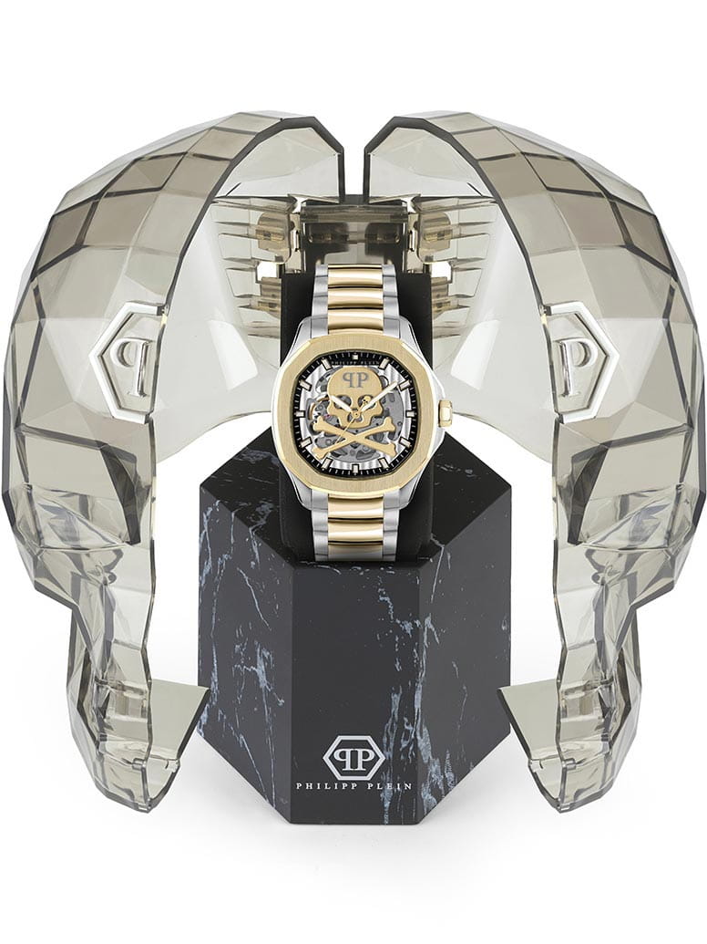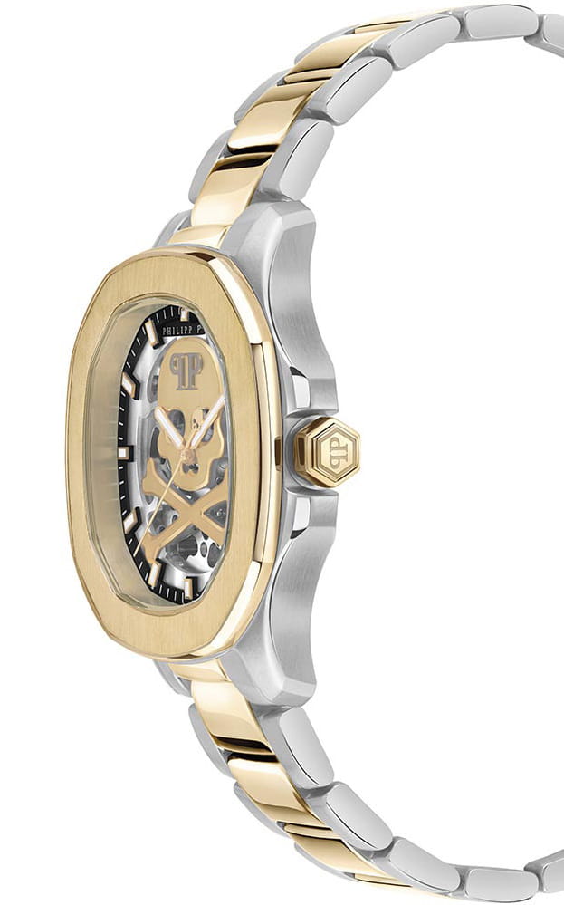 Яркие мужские часы с минеральным стекломМинеральное стеклоМинеральное стекло представляет собой искусственно выращенный минерал кварца. Такое стекло отличается особой устойчивостью к повреждениям и царапинам. Уступает по некоторым качествам сапфировому стеклу. Philipp Plein PWRAA0323, механический механизм с автоподзаводом. Класс водозащиты: 50 метров, позволит защитить корпус от случайных брызг или капель дождя. Корпус часов изготовлен из стали с IP-покрытиемIP-покрытиеМетод ионного напыления. Демонстрирует повышенную устойчивость к истиранию, окислению и химическим веществам. Под воздействием высокого давления и температуры около 1500°C молекулы металла надёжно соединяются с частицами корпуса часов.. Стрелки и метки с люминесцентным покрытиемЛюминесцентное покрытиеПозволяет считывать показания времени в темноте. Производители наносят на стрелки, часовые индексы, безель или поверхность циферблата светонакопительный состав, дающий холодное свечение.. Скелетонизированные. Часы с механизмом, из которого удалён весь «лишний» металл, с прозрачными циферблатом и задней крышкой. Застёжка бабочка с кнопкамиЗастёжка "бабочка"Такой вид застёжки дополняется предохранителями, помогающими избежать случайного раскрытия браслета. Обладают изящным исполнением.