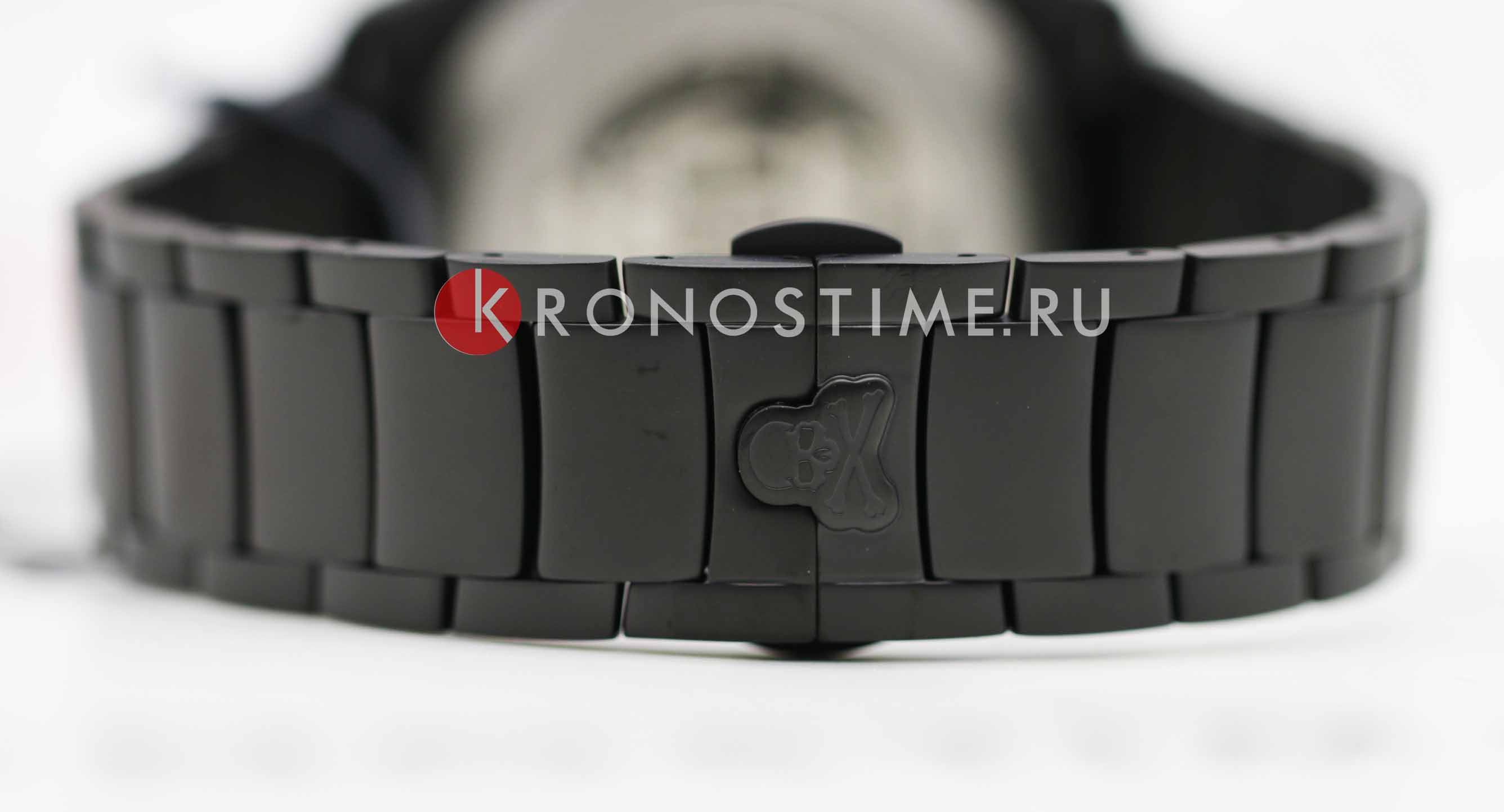 Яркие мужские часы с минеральным стекломМинеральное стеклоМинеральное стекло представляет собой искусственно выращенный минерал кварца. Такое стекло отличается особой устойчивостью к повреждениям и царапинам. Уступает по некоторым качествам сапфировому стеклу. Philipp Plein PWRAA0423, механический механизм с автоподзаводом.  Класс водозащиты: 50 метров, позволит защитить корпус от случайных брызг или капель дождя. Корпус часов изготовлен из стали с IP-покрытиемIP-покрытиеМетод ионного напыления. Демонстрирует повышенную устойчивость к истиранию, окислению и химическим веществам. Под воздействием высокого давления и температуры около 1500°C молекулы металла надёжно соединяются с частицами корпуса часов.. Стрелки и метки с люминесцентным покрытиемЛюминесцентное покрытиеПозволяет считывать показания времени в темноте. Производители наносят на стрелки, часовые индексы, безель или поверхность циферблата светонакопительный состав, дающий холодное свечение.. Скелетонизированные. Часы с механизмом, из которого удалён весь «лишний» металл, с прозрачными циферблатом и задней крышкой. Застёжка бабочка с кнопкамиЗастёжка "бабочка"Такой вид застёжки дополняется предохранителями, помогающими избежать случайного раскрытия браслета. Обладают изящным исполнением.