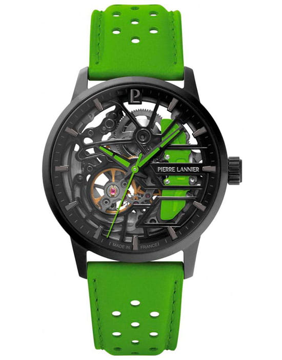 Pierre Lannier Paddock 145G877 — элегантная модель с выразительным спортивным характером. Корпус диаметром 39 мм выполнен из нержавеющей стали с матовым PVD-покрытиемPVDУльтратонкое покрытие наносится в технике вакуумного напыления, сочетает в себе нитрид титана особой прочности со слоем золота или оксида хрома. Несёт в себе декоративную или защитную функцию., подчёркивающим технологичный стиль и динамику дизайна. Циферблат частично скелетонизирован, открывая механизм и баланс, что придаёт модели техническую выразительность. Часовые метки и стрелки покрыты люминесцентным покрытиемЛюминесцентное покрытиеПозволяет считывать показания времени в темноте. Производители наносят на стрелки, часовые индексы, безель или поверхность циферблата светонакопительный состав, дающий холодное свечение., обеспечивая хорошую читаемость в любых условиях. Циферблат защищён прочным минеральным стекломМинеральное стеклоМинеральное стекло представляет собой искусственно выращенный минерал кварца. Такое стекло отличается особой устойчивостью к повреждениям и царапинам. Уступает по некоторым качествам сапфировому стеклу., устойчивым к царапинам и повседневным воздействиям. Водонепроницаемость до 50 метров позволяет использовать часы в различных жизненных ситуациях без ограничений. Внутри — автоматический механизм с автоподзаводом и запасом хода около 42 часов, не требующий подзарядки при регулярном ношении. Ремешок из перфорированной кожи шириной 20 мм дополнен удобной стандартной застежкой, обеспечивающей комфорт и надёжную фиксацию. Paddock — гармоничное сочетание механики, изящества и современного дизайна, созданное для тех, кто ценит уверенность и индивидуальность в деталях.