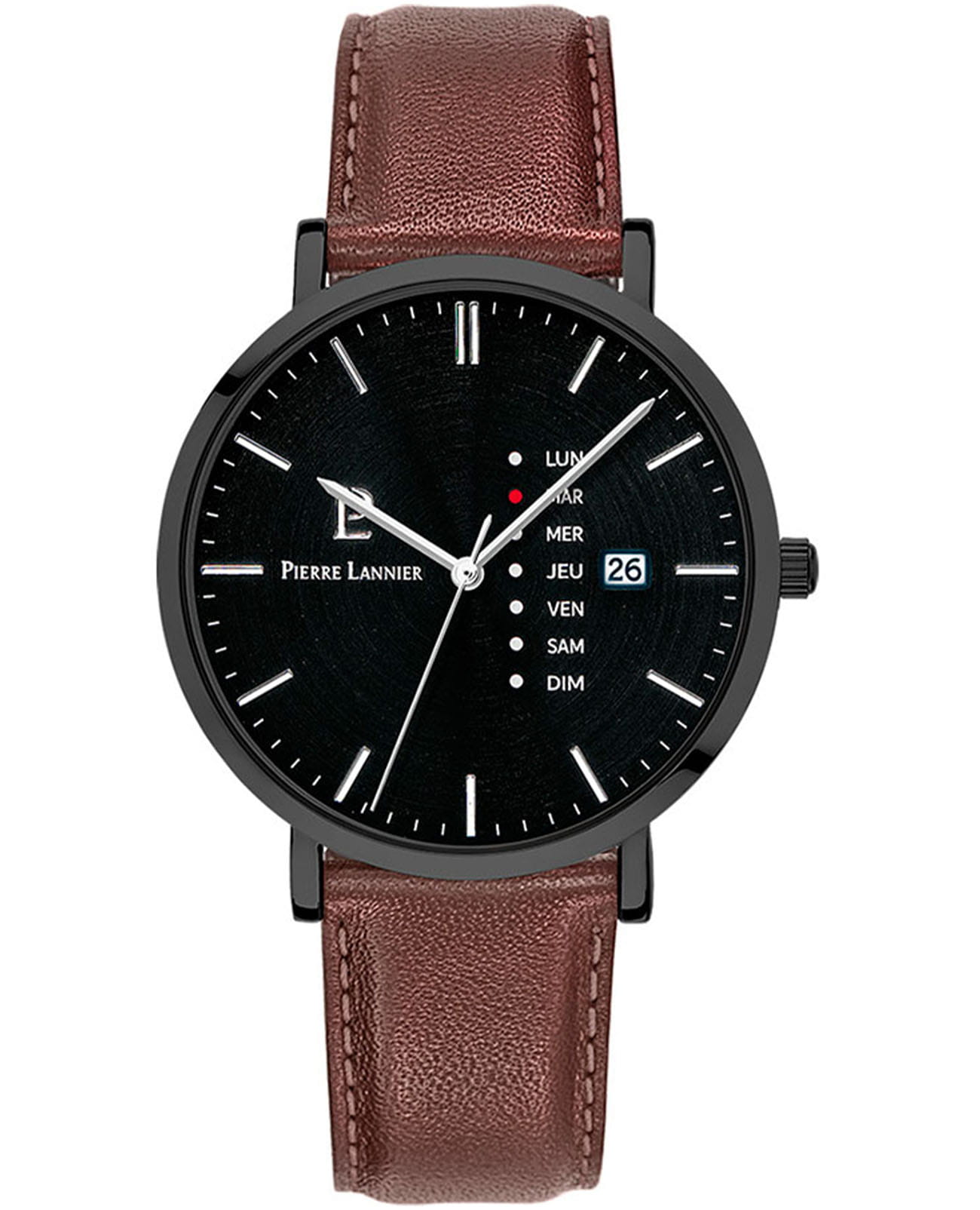 Мужские кварцевые часы Pierre Lannier Data 243H434. Минеральное стеклоМинеральное стеклоМинеральное стекло представляет собой искусственно выращенный минерал кварца. Такое стекло отличается особой устойчивостью к повреждениям и царапинам. Уступает по некоторым качествам сапфировому стеклу. устойчивое к мелким механическим повреждениям. Центральные часовая и минутная стрелки. Апертура даты в позиции 3 часов. Отображение дня недели. Корпус выполнен из нержавеющей стали с IP-покрытиемIP-покрытиеМетод ионного напыления. Демонстрирует повышенную устойчивость к истиранию, окислению и химическим веществам. Под воздействием высокого давления и температуры около 1500°C молекулы металла надёжно соединяются с частицами корпуса часов.. Водостойкость: 30 метров, позволит защитить корпус от случайных брызг или капель дождя. Кожаный ремешок на стандартной застёжке.