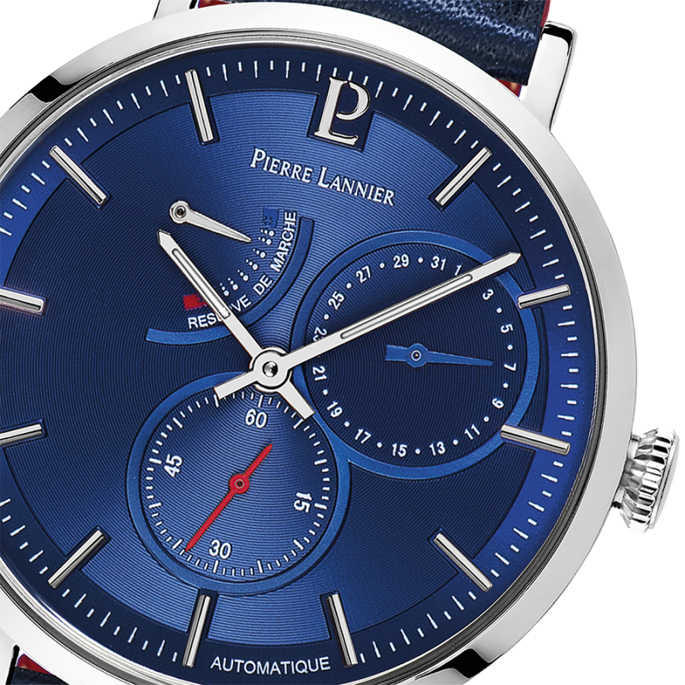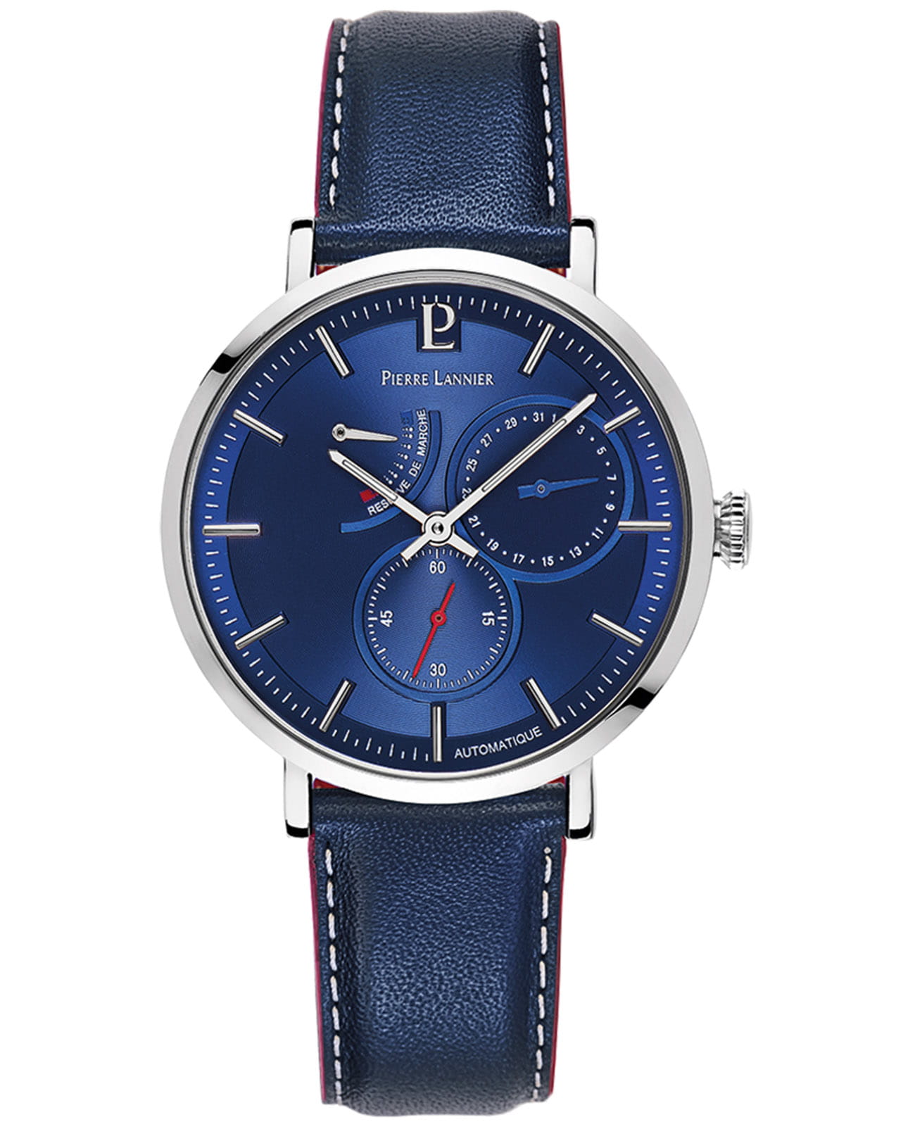 Мужские механические часы с автоподзаводом Pierre Lannier Evidence 327B166. Минеральное стеклоМинеральное стеклоМинеральное стекло представляет собой искусственно выращенный минерал кварца. Такое стекло отличается особой устойчивостью к повреждениям и царапинам. Уступает по некоторым качествам сапфировому стеклу. устойчивое к мелким механическим повреждениям. Центральные часовая и минутная стрелки, секундная стрелка вынесена на малый циферблат. Отображение даты в малом циферблате. Ретроградный индикатор запаса хода. Корпус выполнен из нержавеющей стали. Водостойкость: 50 метров, позволит защитить корпус от случайных брызг или капель дождя. Кожаный ремешок на стандартной застёжке. Стрелки с люминесцентным покрытиемЛюминесцентное покрытиеПозволяет считывать показания времени в темноте. Производители наносят на стрелки, часовые индексы, безель или поверхность циферблата светонакопительный состав, дающий холодное свечение..