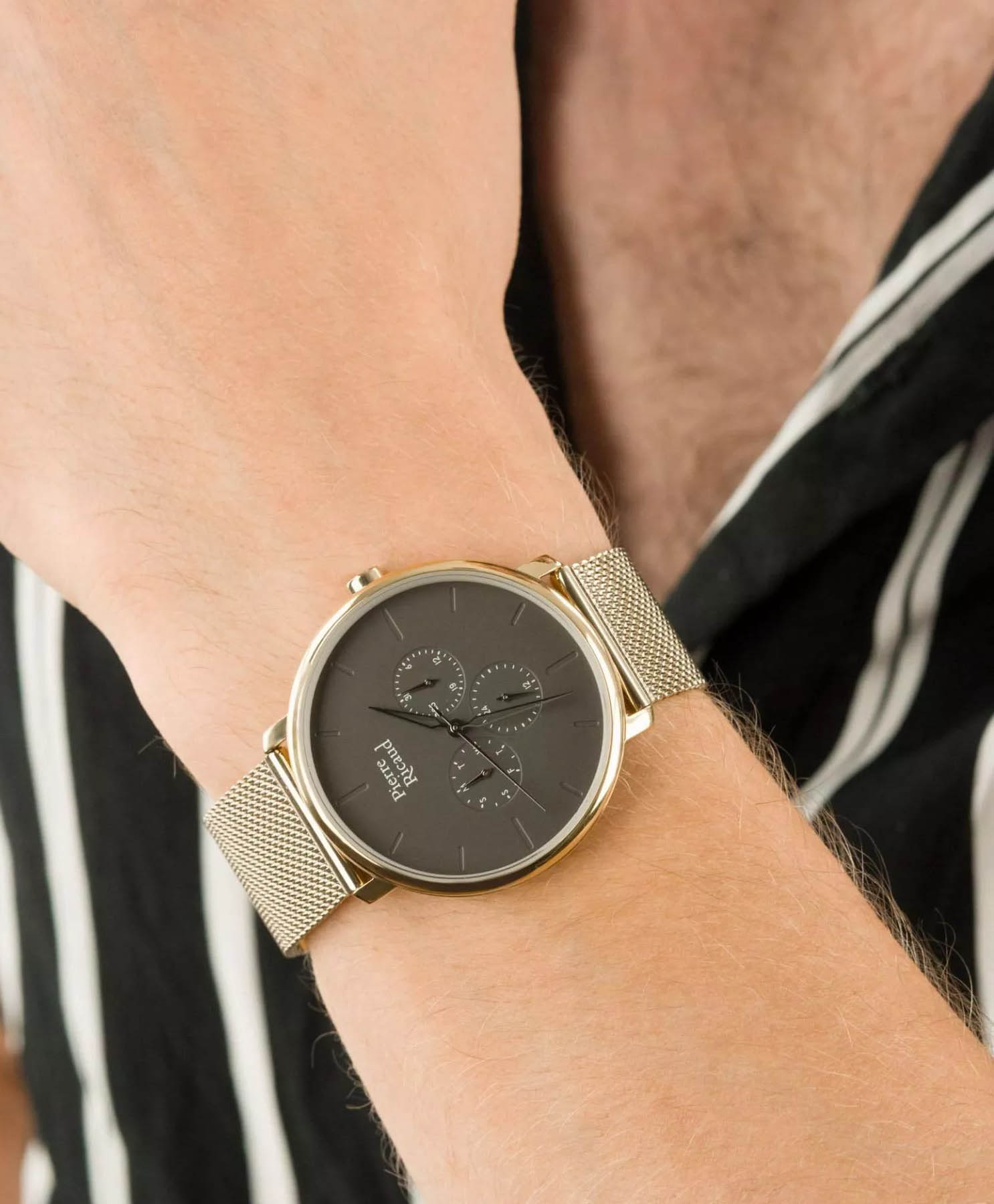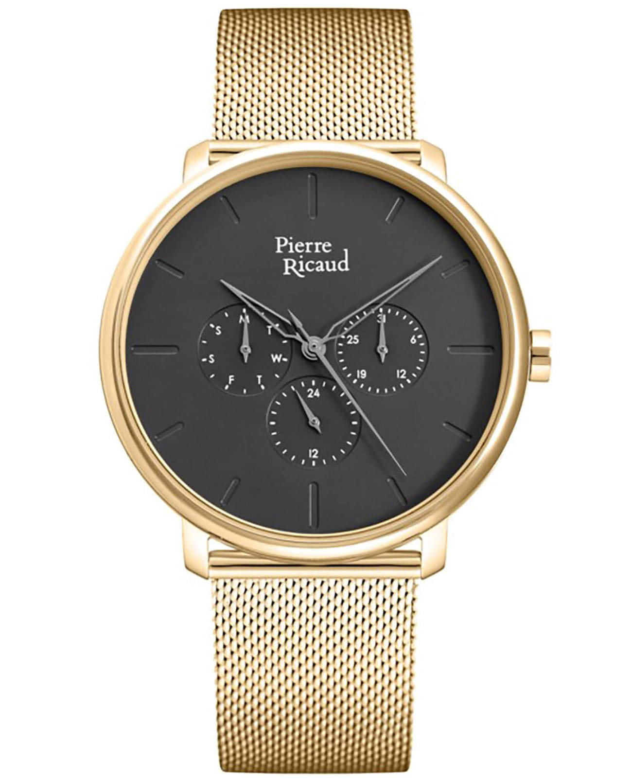 Мужские часы с минеральным стекломМинеральное стеклоМинеральное стекло представляет собой искусственно выращенный минерал кварца. Такое стекло отличается особой устойчивостью к повреждениям и царапинам. Уступает по некоторым качествам сапфировому стеклу. Pierre Ricaud P97169.1116QF, кварцевый механизм с высокой точностью. Класс водозащиты: 50 метров, позволит защитить корпус от случайных брызг или капель дождя. Корпус часов изготовлен из стали с IP-покрытиемIP-покрытиеМетод ионного напыления. Демонстрирует повышенную устойчивость к истиранию, окислению и химическим веществам. Под воздействием высокого давления и температуры около 1500°C молекулы металла надёжно соединяются с частицами корпуса часов.. Стальной браслет на раскладной застёжкеРаскладная застёжкаТакой тип застёжки используется только на браслетах из металла. Она никогда не раскрывается полностью, происходит разделение на 2 и более частей. Раскладывающая застёжка снизит вероятность потери часов к минимуму. с IP-покрытиемIP-покрытиеМетод ионного напыления. Демонстрирует повышенную устойчивость к истиранию, окислению и химическим веществам. Под воздействием высокого давления и температуры около 1500°C молекулы металла надёжно соединяются с частицами корпуса часов..