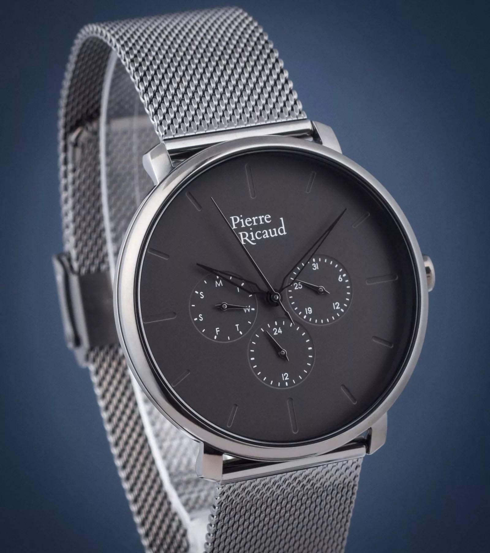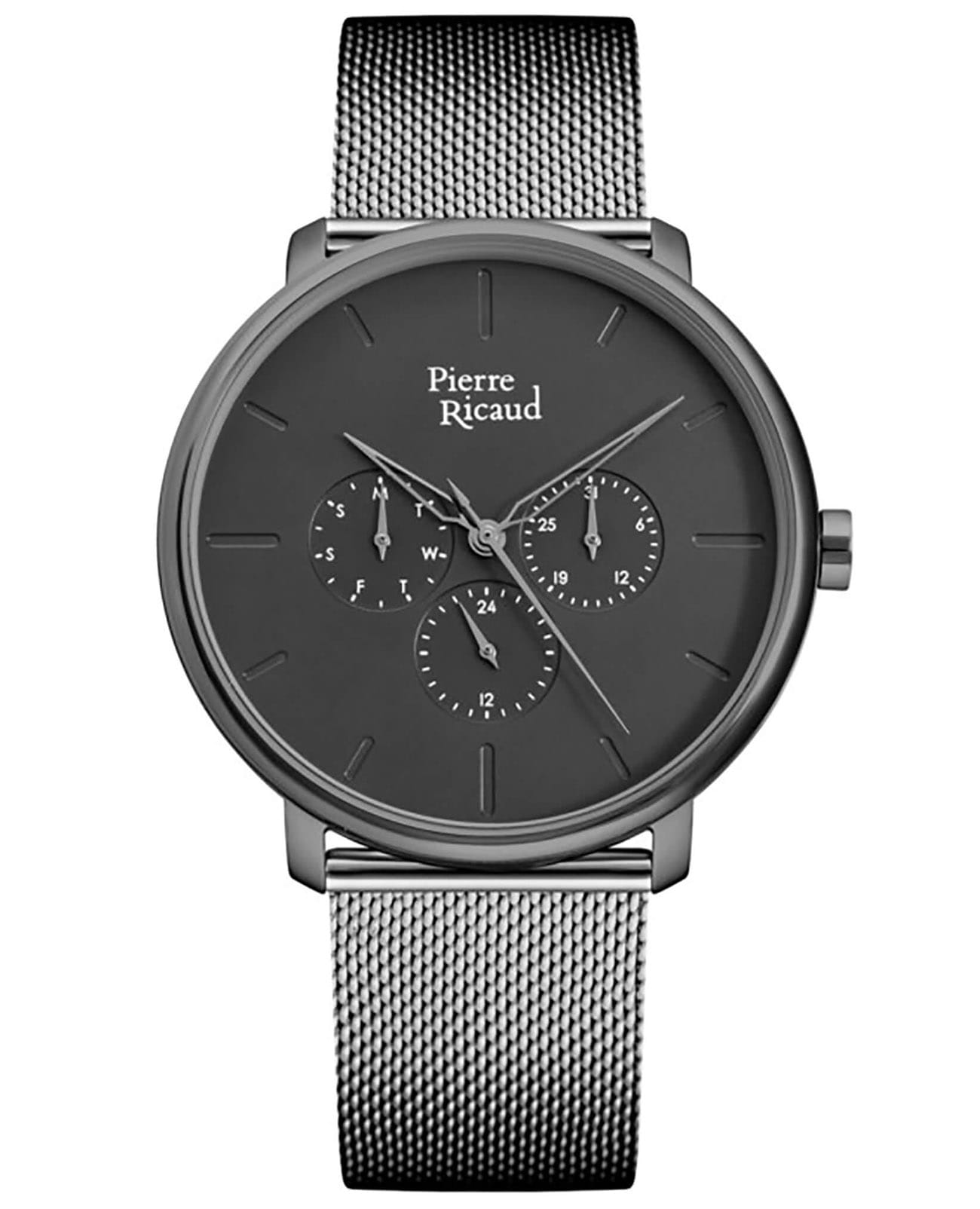 Мужские часы с минеральным стекломМинеральное стеклоМинеральное стекло представляет собой искусственно выращенный минерал кварца. Такое стекло отличается особой устойчивостью к повреждениям и царапинам. Уступает по некоторым качествам сапфировому стеклу. Pierre Ricaud P97169.S116QF, кварцевый механизм с высокой точностью. Класс водозащиты: 50 метров, позволит защитить корпус от случайных брызг или капель дождя. Корпус часов изготовлен из стали с IP-покрытиемIP-покрытиеМетод ионного напыления. Демонстрирует повышенную устойчивость к истиранию, окислению и химическим веществам. Под воздействием высокого давления и температуры около 1500°C молекулы металла надёжно соединяются с частицами корпуса часов.. Стальной браслет на раскладной застёжкеРаскладная застёжкаТакой тип застёжки используется только на браслетах из металла. Она никогда не раскрывается полностью, происходит разделение на 2 и более частей. Раскладывающая застёжка снизит вероятность потери часов к минимуму. с IP-покрытиемIP-покрытиеМетод ионного напыления. Демонстрирует повышенную устойчивость к истиранию, окислению и химическим веществам. Под воздействием высокого давления и температуры около 1500°C молекулы металла надёжно соединяются с частицами корпуса часов..