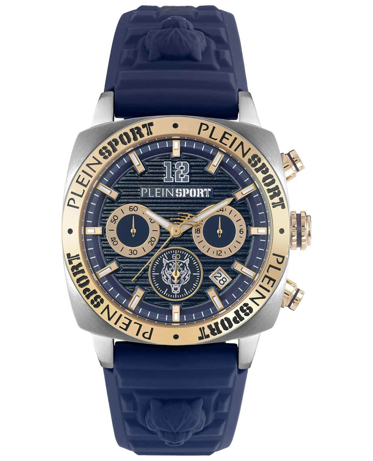Немецкие мужские кварцевые часы-хронографХронографФункция позволяет измерять отрезки времени с особой точностью: часы, минуты, секунды. Верным признаком хронографа является наличие на циферблате 3 дополнительных окошек-счётчиков. с секундомеромСекундомерСекундоме́р — прибор, способный измерять интервалы времени с точностью до долей секунды. Plein Sport Wildcat PSGBA0723, кварцевый механизм с высокой точностью. Класс водозащиты: 50 метров, позволит защитить корпус от случайных брызг или капель дождя. Корпус часов изготовлен из стали. Силиконовый ремешок на стандартной застёжке. БезельБезельВнешний ободок, закрепляющий стекло. В спортивных часах так называется поворотное кольцо с делениями на циферблате, выполняет роль таймера – замеряет отрезки времени на шкале. Неподвижный безель – элемент декора. Однонаправленно вращающийся безель на дайверских часах позволяет фиксировать моменты погружения и выныривания на поверхность. с IP-покрытиемIP-покрытиеМетод ионного напыления. Демонстрирует повышенную устойчивость к истиранию, окислению и химическим веществам. Под воздействием высокого давления и температуры около 1500°C молекулы металла надёжно соединяются с частицами корпуса часов.. Окошко даты находится в положении между 4 и 5 часов.