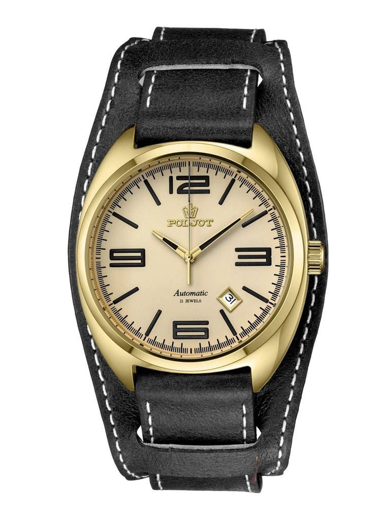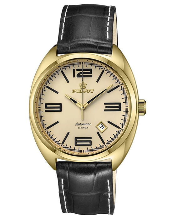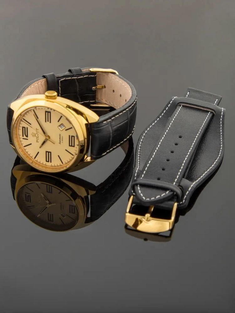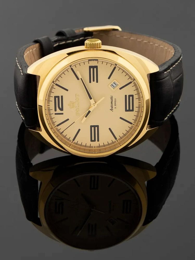 Poljot 8215.246271 — элегантные механические часы с автоподзаводом, сочетающем силу и изысканность. Корпус из нержавеющей стали с PVD-покрытиемPVDУльтратонкое покрытие наносится в технике вакуумного напыления, сочетает в себе нитрид титана особой прочности со слоем золота или оксида хрома. Несёт в себе декоративную или защитную функцию. подчеркивает надёжность и лаконичность дизайна, а глубокий циферблат с золотистыми стрелками придаёт модели благородный акцент. Проверенный японский механизм Miyota 8215 обеспечивает точность хода и долговечность, а плавное движение секундной стрелки подчёркивает качество сборки. Метки и стрелки с люминесцентным покрытиемЛюминесцентное покрытиеПозволяет считывать показания времени в темноте. Производители наносят на стрелки, часовые индексы, безель или поверхность циферблата светонакопительный состав, дающий холодное свечение. обеспечивают отличную читаемость при любом освещении, а окно даты добавляет практичности. Прочное минеральное стеклоМинеральное стеклоМинеральное стекло представляет собой искусственно выращенный минерал кварца. Такое стекло отличается особой устойчивостью к повреждениям и царапинам. Уступает по некоторым качествам сапфировому стеклу. защищает циферблат от царапин, а ремешок из натуральной кожи завершает утончённый облик модели. Poljot — гармония классики и современной механики, созданная для тех, кто ценит традиции и индивидуальность в каждой детали. В комплекте дополнительный ремешок с напульсником.