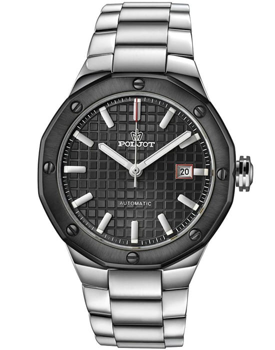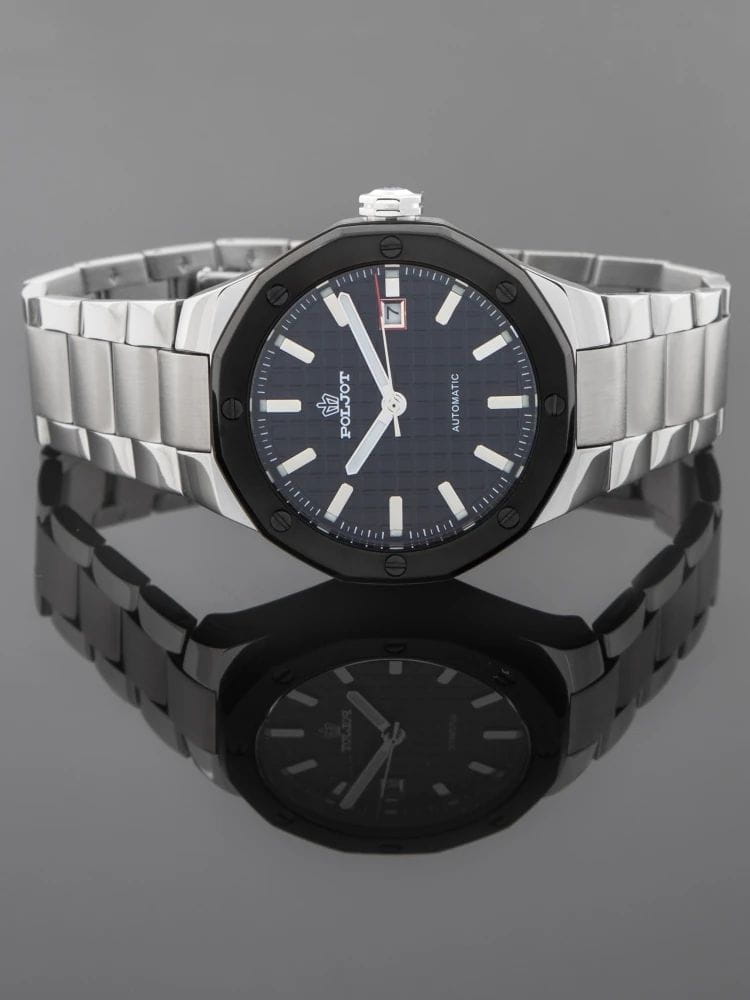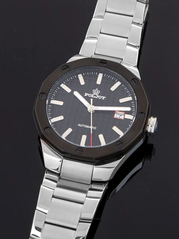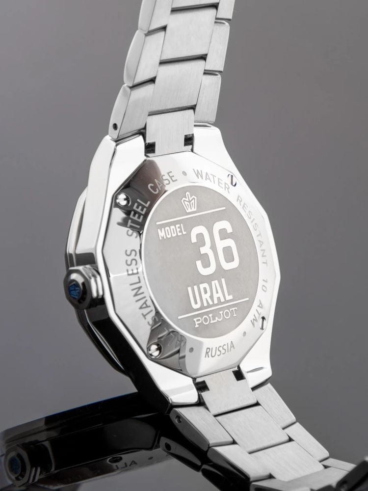 Poljot Ural 8215.363245Б — стильные механические часы с автоподзаводом, сочетающие брутальный характер и современную элегантность. Корпус выполнен из нержавеющей стали, что придаёт модели монолитность и прочность, а глубокий циферблат с фактурным геометрическим узором подчеркивает премиальный облик. Стальной браслет на застёжке-бабочке с кнопкамиЗастёжка "бабочка"Такой вид застёжки дополняется предохранителями, помогающими избежать случайного раскрытия браслета. Обладают изящным исполнением. . БезельБезельВнешний ободок, закрепляющий стекло. В спортивных часах так называется поворотное кольцо с делениями на циферблате, выполняет роль таймера – замеряет отрезки времени на шкале. Неподвижный безель – элемент декора. Однонаправленно вращающийся безель на дайверских часах позволяет фиксировать моменты погружения и выныривания на поверхность. с PVD-покрытиемPVDУльтратонкое покрытие наносится в технике вакуумного напыления, сочетает в себе нитрид титана особой прочности со слоем золота или оксида хрома. Несёт в себе декоративную или защитную функцию.. Внутри установлен надёжный японский механизм Miyota 8215, обеспечивающий точный ход и плавную работу стрелок. Широкие метки и стрелки с люминесцентным покрытиемЛюминесцентное покрытиеПозволяет считывать показания времени в темноте. Производители наносят на стрелки, часовые индексы, безель или поверхность циферблата светонакопительный состав, дающий холодное свечение. гарантируют превосходную читаемость в любое время суток, а окно даты добавляет удобства. Прочное минеральное стеклоМинеральное стеклоМинеральное стекло представляет собой искусственно выращенный минерал кварца. Такое стекло отличается особой устойчивостью к повреждениям и царапинам. Уступает по некоторым качествам сапфировому стеклу. защищает циферблат от повреждений, а водонепроницаемость до 10 бар делает часы надёжным спутником как в деловом, так и активном образе жизни. Poljot Ural — воплощение силы, точности и мужского стиля, созданное для тех, кто ценит механику и уверенность в каждой детали.