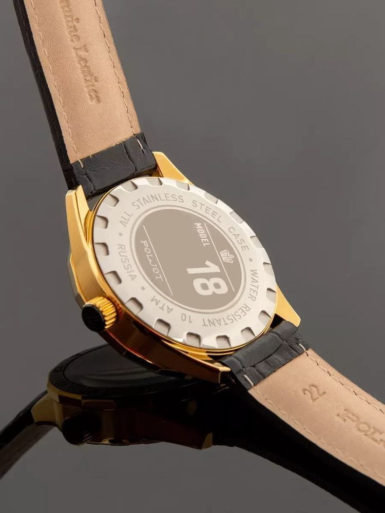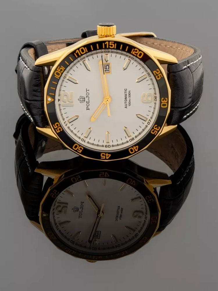 Poljot NH35A.186263 — надёжные механические мужские часы с автоподзаводом, сочетающие техническую точность и выразительный спортивный стиль. Корпус из нержавеющей стали  с PVD-покрытиемPVDУльтратонкое покрытие наносится в технике вакуумного напыления, сочетает в себе нитрид титана особой прочности со слоем золота или оксида хрома. Несёт в себе декоративную или защитную функцию. подчёркивает прочность конструкции, а насыщенный циферблат с акцентами на стрелках и метках придаёт модели динамичный и современный облик. БезельБезельВнешний ободок, закрепляющий стекло. В спортивных часах так называется поворотное кольцо с делениями на циферблате, выполняет роль таймера – замеряет отрезки времени на шкале. Неподвижный безель – элемент декора. Однонаправленно вращающийся безель на дайверских часах позволяет фиксировать моменты погружения и выныривания на поверхность. с PVD-покрытиемPVDУльтратонкое покрытие наносится в технике вакуумного напыления, сочетает в себе нитрид титана особой прочности со слоем золота или оксида хрома. Несёт в себе декоративную или защитную функцию.. Внутри установлен проверенный японский механизм SEIKO NH35, обеспечивающий стабильную работу и плавный ход секундной стрелки. Окно даты добавляет функциональности, а широкие метки с люминесцентным покрытиемЛюминесцентное покрытиеПозволяет считывать показания времени в темноте. Производители наносят на стрелки, часовые индексы, безель или поверхность циферблата светонакопительный состав, дающий холодное свечение. обеспечивают отличную читаемость даже в темноте. Прочное минеральное стеклоМинеральное стеклоМинеральное стекло представляет собой искусственно выращенный минерал кварца. Такое стекло отличается особой устойчивостью к повреждениям и царапинам. Уступает по некоторым качествам сапфировому стеклу. защищает циферблат от царапин, а ремешок из натуральной кожи с контрастной прострочкой гарантирует комфорт и надёжную посадку. Poljot — часы с характером, созданные для тех, кто ценит точность, качество и спортивную уверенность в каждой детали.