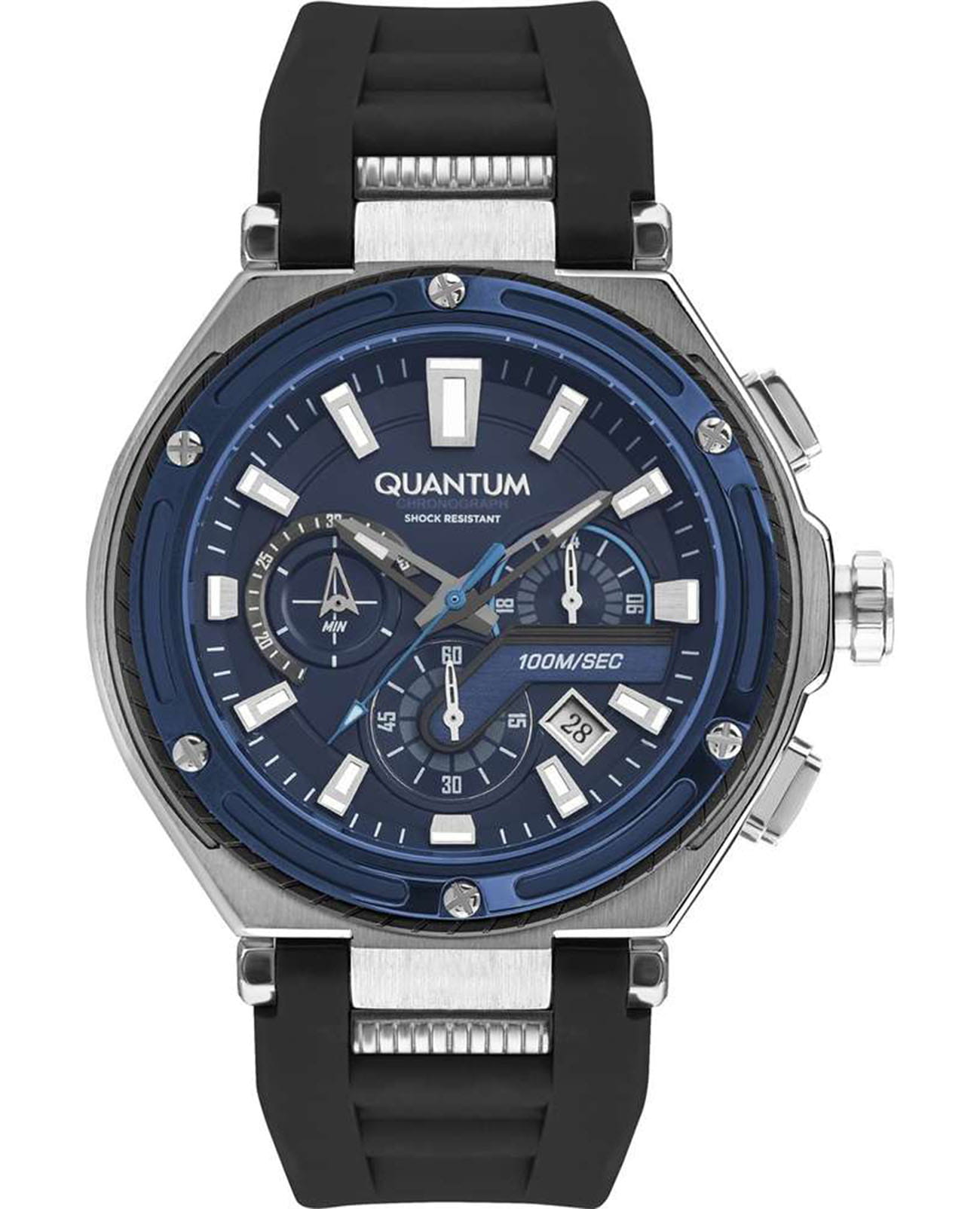 Мужские кварцевые часы Quantum HNG1010.391 из коллекции Hunter — крупные, надёжные и функциональные спортивные часы в классическом исполнении. Корпус круглый, из нержавеющей стали, диаметром 50 мм. Циферблат синий со штриховыми метками, с функциями хронографаХронографФункция позволяет измерять отрезки времени с особой точностью: часы, минуты, секунды. Верным признаком хронографа является наличие на циферблате 3 дополнительных окошек-счётчиков. и окошком даты. БезельБезельВнешний ободок, закрепляющий стекло. В спортивных часах так называется поворотное кольцо с делениями на циферблате, выполняет роль таймера – замеряет отрезки времени на шкале. Неподвижный безель – элемент декора. Однонаправленно вращающийся безель на дайверских часах позволяет фиксировать моменты погружения и выныривания на поверхность. с PVD-покрытиемPVDУльтратонкое покрытие наносится в технике вакуумного напыления, сочетает в себе нитрид титана особой прочности со слоем золота или оксида хрома. Несёт в себе декоративную или защитную функцию. синий. Стекло — минеральноеМинеральное стеклоМинеральное стекло представляет собой искусственно выращенный минерал кварца. Такое стекло отличается особой устойчивостью к повреждениям и царапинам. Уступает по некоторым качествам сапфировому стеклу. с антибликовым покрытием. Механизм — японский кварцевый Seiko. Корпус — ударопрочныйУдаропрочный корпусМеханизм заключён в корпус, выполненный из современных материалов, устойчивых к ударам, механическим повреждениям и падению с высоты: инновационный пластик, карбон, нержавеющая сталь, титан.. Водонепроницаемость 100 м. Ремешок — чёрный каучуковый на стандартной застёжке. Идеальный выбор для тех, кто ценит турецкий дизайн и повседневную надёжность.