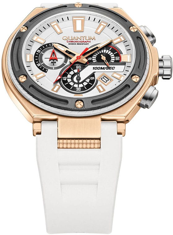 Мужские кварцевые часы Quantum HNG1010.835 из коллекции Hunter — крупные, надёжные и функциональные спортивные часы в классическом исполнении. Корпус круглый, из нержавеющей стали с PVD-покрытиемPVDУльтратонкое покрытие наносится в технике вакуумного напыления, сочетает в себе нитрид титана особой прочности со слоем золота или оксида хрома. Несёт в себе декоративную или защитную функцию., диаметром 50 мм. Циферблат белый со штриховыми метками, с функциями хронографаХронографФункция позволяет измерять отрезки времени с особой точностью: часы, минуты, секунды. Верным признаком хронографа является наличие на циферблате 3 дополнительных окошек-счётчиков. и окошком даты. БезельБезельВнешний ободок, закрепляющий стекло. В спортивных часах так называется поворотное кольцо с делениями на циферблате, выполняет роль таймера – замеряет отрезки времени на шкале. Неподвижный безель – элемент декора. Однонаправленно вращающийся безель на дайверских часах позволяет фиксировать моменты погружения и выныривания на поверхность. с PVD-покрытиемPVDУльтратонкое покрытие наносится в технике вакуумного напыления, сочетает в себе нитрид титана особой прочности со слоем золота или оксида хрома. Несёт в себе декоративную или защитную функцию. чёрный. Стекло — минеральноеМинеральное стеклоМинеральное стекло представляет собой искусственно выращенный минерал кварца. Такое стекло отличается особой устойчивостью к повреждениям и царапинам. Уступает по некоторым качествам сапфировому стеклу. с антибликовым покрытием. Механизм — японский кварцевый Seiko. Корпус — ударопрочныйУдаропрочный корпусМеханизм заключён в корпус, выполненный из современных материалов, устойчивых к ударам, механическим повреждениям и падению с высоты: инновационный пластик, карбон, нержавеющая сталь, титан.. Водонепроницаемость 100 м. Ремешок — белый силиконовый на стандартной застёжке. Идеальный выбор для тех, кто ценит турецкий дизайн и повседневную надёжность.