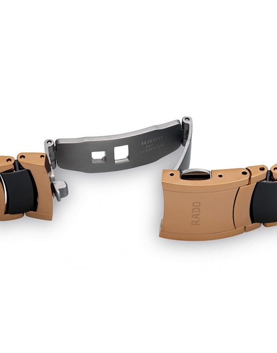 Круглый циферблат чёрного цвета выполнен в стиле минимализм. Он инкрустирован 4 бриллиантами весом в 0,011 карат, переливающиеся сияющие грани придают модели роскоши и великолепие. Оригинальный браслет из нержавеющей стали 316L имеет вставки из высокотехнологичной керамикиВысокотехнологичная керамикаИнновационный запатентованный Rado материал с гладкой или матовой поверхностью. Керамика за счёт кристаллической структуры обладает повышенной устойчивостью от возникновения царапин. Материал способен принимать температуру тела человека, обеспечивая невероятный комфорт при ношении.. Наручные часы оснащены кварцевым механизмом ETA 955.112 с высокой точностью хода. Надёжное стекло из сапфира. PVD-покрытиеPVDУльтратонкое покрытие наносится в технике вакуумного напыления, сочетает в себе нитрид титана особой прочности со слоем золота или оксида хрома. Несёт в себе декоративную или защитную функцию. цвета розового золота. Апертура даты. Диаметр корпуса: 38 мм.