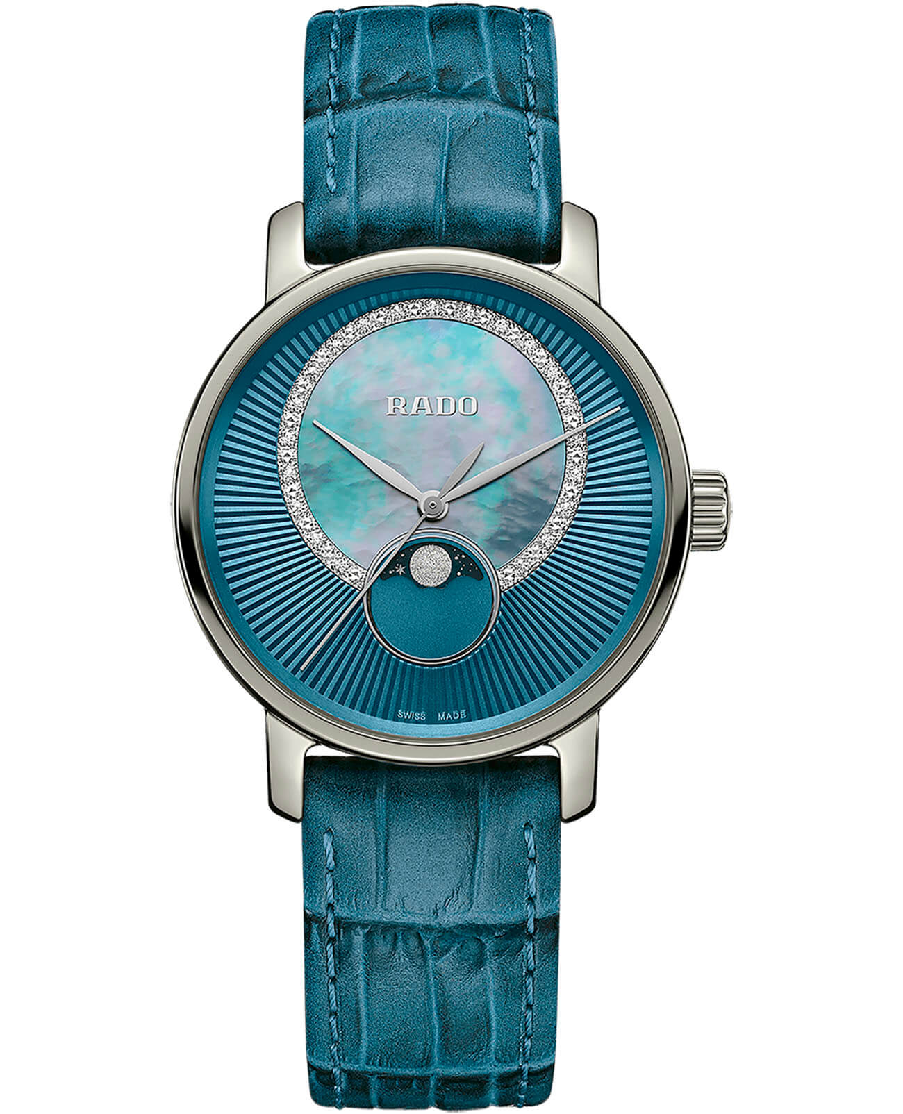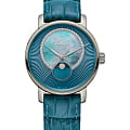 Аксессуар премиальной категории сразу бросается в глаза благодаря насыщенному бирюзовому исполнению. Отдельную привлекательность представляет собой узорчатый циферблат с перламутровой вставкой, декорированный 21 бриллиантами в 0,060 карат. Корпус и безель сделаны из плазменной керамикиВысокотехнологичная плазменная керамикаИнновационный материал, технология запатентована. Выплавление керамики осуществляется в печи при 20 000 °C, белоснежный материал под воздействием ультравысокой температуры приобретает уникальный блеск, присущий металлам., что обеспечивает максимально комфортное ношение. Кварцевый механизм ETA F05.841. Сапфировое стекло с антибликовой поверхностью. Задняя крышка с гравировкой. Кожаный ремешок из натурального материала. Миниатюрное окошко отображает фазы луны. Диаметр корпуса: 35 мм.