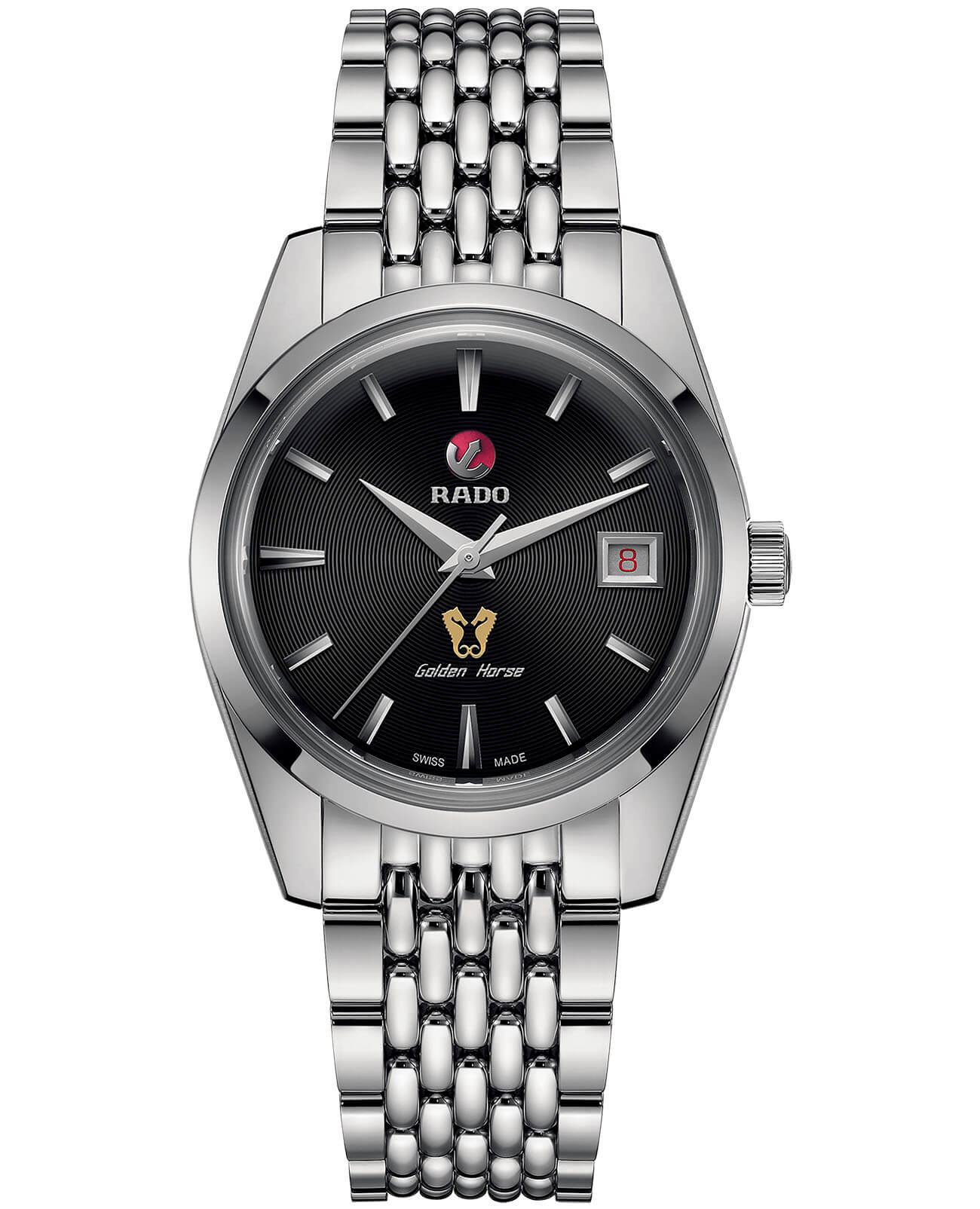 Модель относится к премиальному сегменту, стильно смотрится чёрный узорчатый циферблат с контрастными элементами. Нижняя часть дополнена эмблемой в виде морских коньков, в верхней находится узнаваемый логотип Rado. Часы сделаны из нержавеющей стали 316L, как и первые аксессуары из линейки Golden Horse. Корпус защищает автоматический механизм ETA C07.611 с резервом хода 80 часов от ударов и повреждений. Задняя крышка имеет отличительную гравировку. Сапфировое стекло с покрытием «антиблик». Водостойкость до 5 бар. Отображение текущего числа. Диаметр корпуса: 36,5 мм.
