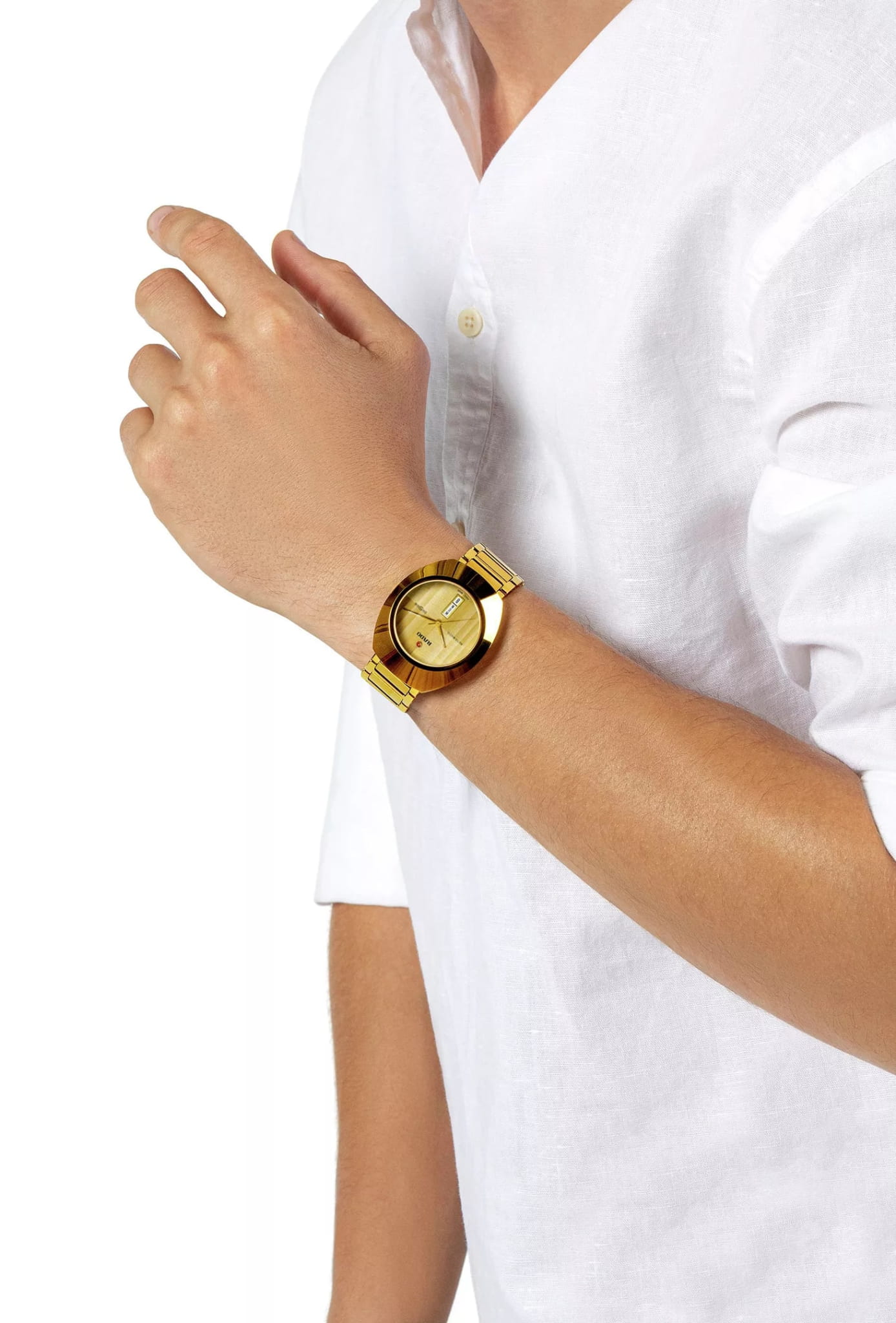 Мужские часы Rado The Original Automatic R12161253 с надёжным автоматическим механизмом. Корпус и браслет часов выполнены из нержавеющей стали c PVD-покрытиемPVDУльтратонкое покрытие наносится в технике вакуумного напыления, сочетает в себе нитрид титана особой прочности со слоем золота или оксида хрома. Несёт в себе декоративную или защитную функцию.. Браслет на раскладной застёжкеРаскладная застёжкаТакой тип застёжки используется только на браслетах из металла. Она никогда не раскрывается полностью, происходит разделение на 2 и более частей. Раскладывающая застёжка снизит вероятность потери часов к минимуму.. Класс водозащиты: 30 метров, позволит защитить корпус от случайных брызг или капель дождя. Окошко даты и дня недели находится в положении 6 часов. Стрелки и метки с люминесцентным покрытиемЛюминесцентное покрытиеПозволяет считывать показания времени в темноте. Производители наносят на стрелки, часовые индексы, безель или поверхность циферблата светонакопительный состав, дающий холодное свечение..