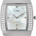 Часы Rado Sintra R13577909, произведение искусства и технологическое чудо, станут прекрасным дополнением к коллекции. Эти швейцарские часы оснащены кварцевым механизмом с указателем даты и тремя стрелками, заключенным в корпус из нержавеющей стали. Браслет изготовлен из высокотехнологичной керамикиВысокотехнологичная керамикаИнновационный запатентованный Rado материал с гладкой или матовой поверхностью. Керамика за счёт кристаллической структуры обладает повышенной устойчивостью от возникновения царапин. Материал способен принимать температуру тела человека, обеспечивая невероятный комфорт при ношении. с раскладной застёжкойРаскладная застёжкаТакой тип застёжки используется только на браслетах из металла. Она никогда не раскрывается полностью, происходит разделение на 2 и более частей. Раскладывающая застёжка снизит вероятность потери часов к минимуму.. Корпус украшен 48 бриллиантами, циферблат 4 бриллианта, браслет 102 бриллианта. Сапфировое стеклоСапфировое стеклоПрочный и надёжный материал из кристалла сапфира синтетического происхождения, характеризующийся особой твёрдостью и устойчивостью к царапинам и повреждениям. устойчивое к появлению царапин, обладающее высокой прозрачностью. Класс водозащиты: 30 метров, позволит защитить корпус от случайных брызг или капель дождя.