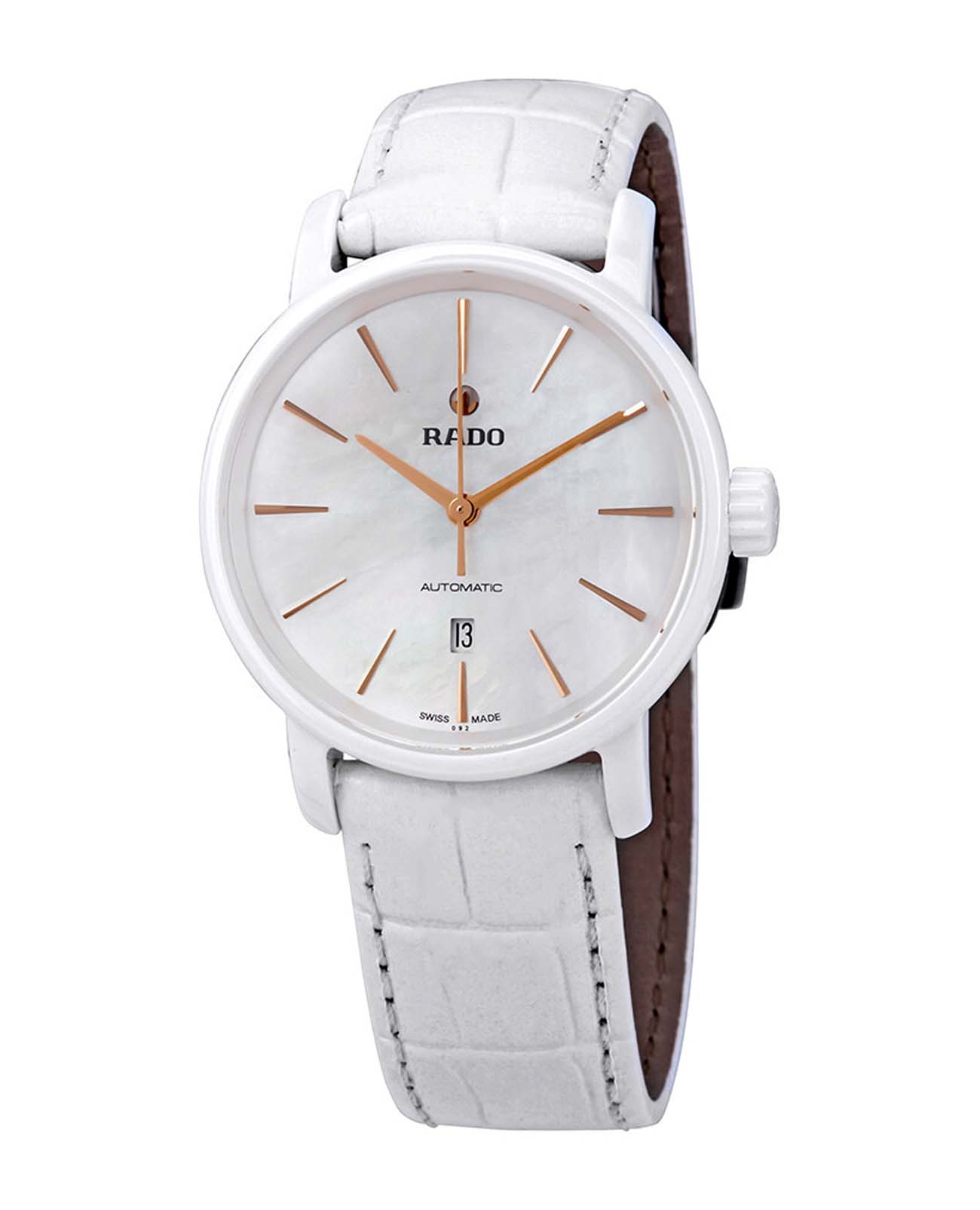 Женские швейцарские механические часы с автоподзаводом Rado Diamaster R14044925. Сапфировое стеклоСапфировое стеклоПрочный и надёжный материал из кристалла сапфира синтетического происхождения, характеризующийся особой твёрдостью и устойчивостью к царапинам и повреждениям. устойчивое к мелким механическим повреждениям. Корпус часов изготовлен из высокотехнологичной керамикиВысокотехнологичная керамикаИнновационный запатентованный Rado материал с гладкой или матовой поверхностью. Керамика за счёт кристаллической структуры обладает повышенной устойчивостью от возникновения царапин. Материал способен принимать температуру тела человека, обеспечивая невероятный комфорт при ношении.. Окошко даты находится в положении 6 часов. Класс водозащиты: 50 метров, позволит защитить корпус от случайных брызг или капель дождя. Кожаный ремешок с раскладной застёжкойРаскладная застёжкаТакой тип застёжки используется только на браслетах из металла. Она никогда не раскрывается полностью, происходит разделение на 2 и более частей. Раскладывающая застёжка снизит вероятность потери часов к минимуму..