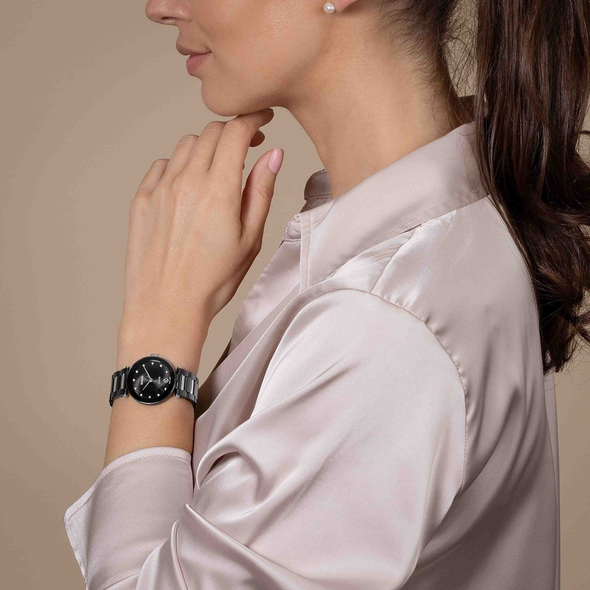 Женские кварцевые часы Rado — это изысканный аксессуар с современным дизайном. Корпус диаметром 31 мм выполнен из высокотехнологичной керамикиВысокотехнологичная керамикаИнновационный запатентованный Rado материал с гладкой или матовой поверхностью. Керамика за счёт кристаллической структуры обладает повышенной устойчивостью от возникновения царапин. Материал способен принимать температуру тела человека, обеспечивая невероятный комфорт при ношении. и нержавеющей стали с PVD-покрытиемPVDУльтратонкое покрытие наносится в технике вакуумного напыления, сочетает в себе нитрид титана особой прочности со слоем золота или оксида хрома. Несёт в себе декоративную или защитную функцию. розового золота. Циферблат чёрного цвета оформлен аналоговым дисплеем. Циферблат защищён выпуклым сапфировым стекломСапфировое стеклоПрочный и надёжный материал из кристалла сапфира синтетического происхождения, характеризующийся особой твёрдостью и устойчивостью к царапинам и повреждениям.. Окошко даты расположено в положении 3 часов. Механизм — кварцевый. Часы оснащены браслетом из комбинации керамики и стали с PVD-покрытиемPVDУльтратонкое покрытие наносится в технике вакуумного напыления, сочетает в себе нитрид титана особой прочности со слоем золота или оксида хрома. Несёт в себе декоративную или защитную функцию. и застёжкой «бабочка» с кнопкамиЗастёжка "бабочка"Такой вид застёжки дополняется предохранителями, помогающими избежать случайного раскрытия браслета. Обладают изящным исполнением. . Водонепроницаемость 50 м позволяет использовать часы в повседневных условиях. Гарантия — 5 лет на механизм, 2 года на изделие. Идеальный выбор для тех, кто ценит стиль, качество и универсальность.