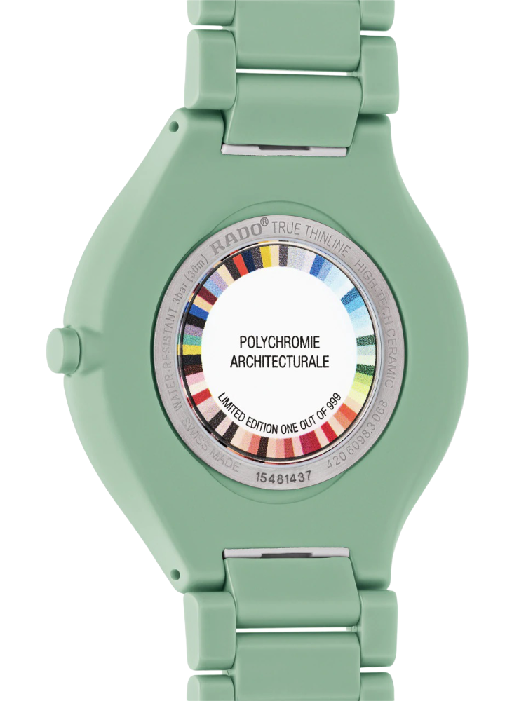 Швейцарские часы из лимитированной серии 999 экземпляров Rado True Thinline Le Corbusier R27096662, кварцевый механизм с высокой точностью. Сапфировое стекло устойчивое к появлению царапин, обладающее высокой прозрачностью. Класс водозащиты: 30 метров, позволит защитить корпус от случайных брызг или капель дождя. Корпус часов изготовлен из керамики, зеленого цвета.