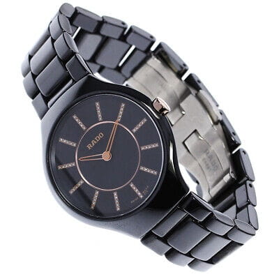Швейцарские женские Rado True Thinline Diamonds R27742702, кварцевый механизм с высокой точностью. Сапфировое стеклоСапфировое стеклоПрочный и надёжный материал из кристалла сапфира синтетического происхождения, характеризующийся особой твёрдостью и устойчивостью к царапинам и повреждениям. устойчивое к появлению царапин, обладающее высокой прозрачностью. Корпус часов изготовлен из высокотехнологичной керамикиВысокотехнологичная керамикаИнновационный запатентованный Rado материал с гладкой или матовой поверхностью. Керамика за счёт кристаллической структуры обладает повышенной устойчивостью от возникновения царапин. Материал способен принимать температуру тела человека, обеспечивая невероятный комфорт при ношении.. Циферблат украшен бриллиантами. Класс водозащиты: 30 метров, позволит защитить корпус от случайных брызг или капель дождя. Керамический браслет на застёжке-бабочке с кнопкамиЗастёжка "бабочка"Такой вид застёжки дополняется предохранителями, помогающими избежать случайного раскрытия браслета. Обладают изящным исполнением. .