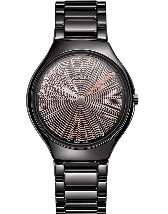 Ультратонкая модель Limited Edition (5 мм) отличается необычным циферблатом. Под сапфировым стеклом установлены 2 прозрачных диска, декорированных ажурным орнаментом, напоминающем паутину. Пересечение стрелок создаёт иллюзию наличия стрелок, что привело к рождению эксклюзивного аксессуара, способного приковывать взгляды окружающих. Швейцарский автоматический механизм ETA 2892-A2 с запасом хода 54 часа. Корпус и браслет из высокотехнологичной керамикиВысокотехнологичная керамикаИнновационный запатентованный Rado материал с гладкой или матовой поверхностью. Керамика за счёт кристаллической структуры обладает повышенной устойчивостью от возникновения царапин. Материал способен принимать температуру тела человека, обеспечивая невероятный комфорт при ношении.. Водонепроницаемость 3 бар. . Диаметр корпуса: 40 мм.