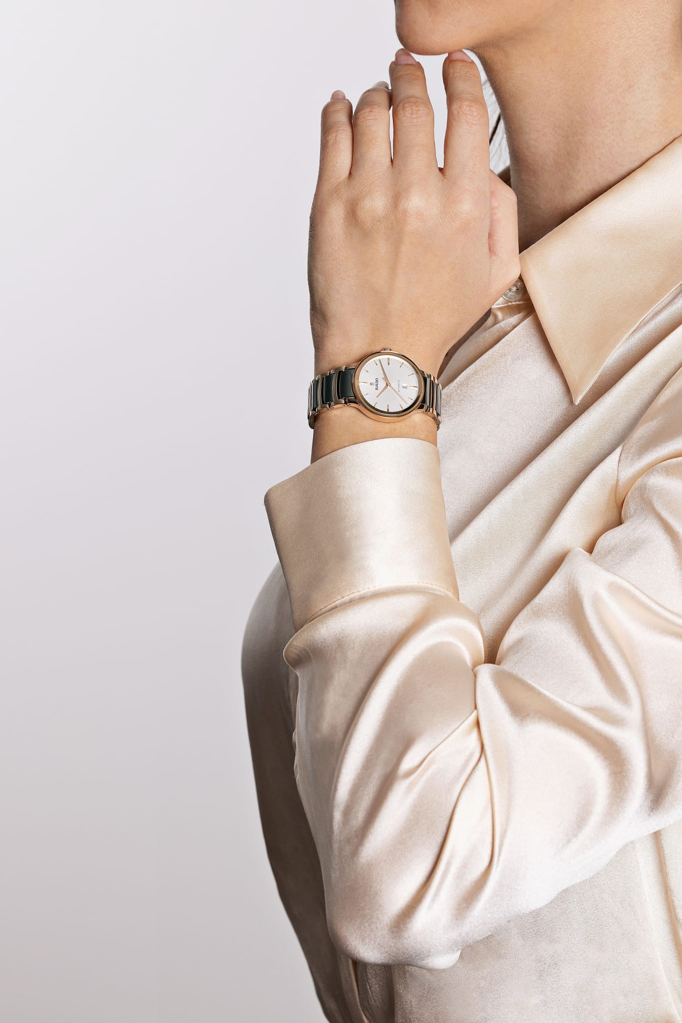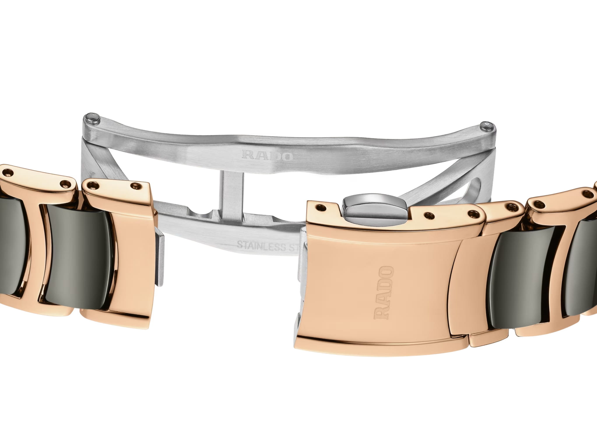 Швейцарские женские механические часы с автоматическим подзаводом Rado Centrix Automatic R30019012. Корпус часов изготовлен из нержавеющей стали с PVD-покрытиемPVDУльтратонкое покрытие наносится в технике вакуумного напыления, сочетает в себе нитрид титана особой прочности со слоем золота или оксида хрома. Несёт в себе декоративную или защитную функцию.. Браслет из стали и высокотехнологичной керамикиВысокотехнологичная керамикаИнновационный запатентованный Rado материал с гладкой или матовой поверхностью. Керамика за счёт кристаллической структуры обладает повышенной устойчивостью от возникновения царапин. Материал способен принимать температуру тела человека, обеспечивая невероятный комфорт при ношении. на раскладной застёжкеРаскладная застёжкаТакой тип застёжки используется только на браслетах из металла. Она никогда не раскрывается полностью, происходит разделение на 2 и более частей. Раскладывающая застёжка снизит вероятность потери часов к минимуму.. Сапфировое стеклоСапфировое стеклоПрочный и надёжный материал из кристалла сапфира синтетического происхождения, характеризующийся особой твёрдостью и устойчивостью к царапинам и повреждениям. устойчивое к мелким механическим повреждениям. Класс водозащиты: 50 метров, позволит защитить корпус от случайных брызг или капель дождя. Окошко даты находится в положении 6 часов.