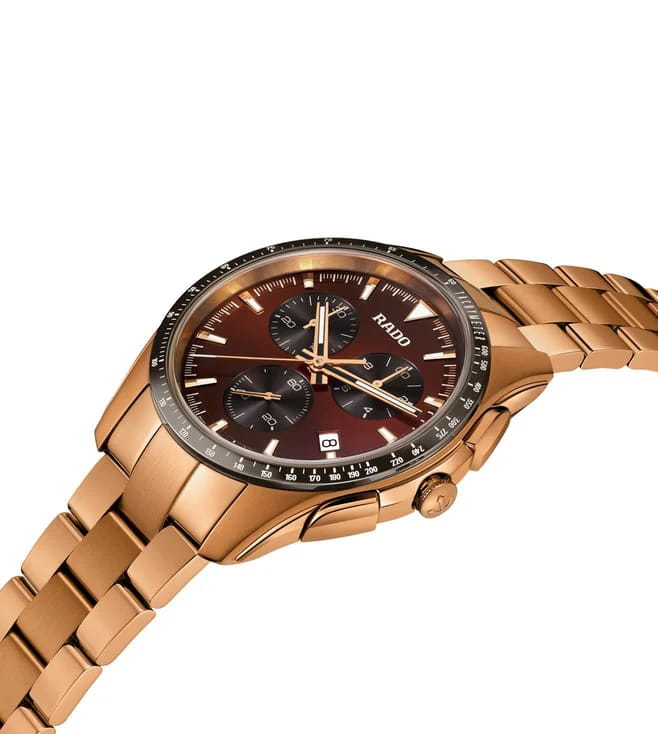 Мужские наручные часы-хронографХронографФункция позволяет измерять отрезки времени с особой точностью: часы, минуты, секунды. Верным признаком хронографа является наличие на циферблате 3 дополнительных окошек-счётчиков. Rado Hyperchrome Chronograph. Корпус часов изготовлен из нержавеющей стали с PVD-покрытиемPVDУльтратонкое покрытие наносится в технике вакуумного напыления, сочетает в себе нитрид титана особой прочности со слоем золота или оксида хрома. Несёт в себе декоративную или защитную функцию.. Стальной браслет с PVD-покрытиемPVDУльтратонкое покрытие наносится в технике вакуумного напыления, сочетает в себе нитрид титана особой прочности со слоем золота или оксида хрома. Несёт в себе декоративную или защитную функцию. на застёжкой «бабочка» с кнопкамиЗастёжка "бабочка"Такой вид застёжки дополняется предохранителями, помогающими избежать случайного раскрытия браслета. Обладают изящным исполнением. . БезельБезельВнешний ободок, закрепляющий стекло. В спортивных часах так называется поворотное кольцо с делениями на циферблате, выполняет роль таймера – замеряет отрезки времени на шкале. Неподвижный безель – элемент декора. Однонаправленно вращающийся безель на дайверских часах позволяет фиксировать моменты погружения и выныривания на поверхность. со шкалой тахиметраТахиметрРазмеченная шкала, располагается на ободке или безеле часов. Тахиметр позволяет рассчитать скорость на определённом участке пути, расстояние измеряется в километрах или милях.. Окошко даты находится в положении 4 часа. Стрелки и метки с люминесцентным покрытиемЛюминесцентное покрытиеПозволяет считывать показания времени в темноте. Производители наносят на стрелки, часовые индексы, безель или поверхность циферблата светонакопительный состав, дающий холодное свечение.. Сапфировое стеклоСапфировое стеклоПрочный и надёжный материал из кристалла сапфира синтетического происхождения, характеризующийся особой твёрдостью и устойчивостью к царапинам и повреждениям. с антибликовым покрытиемАнтибликовое покрытиеСлой оксида металла в 0,13-0,3 микрон, благодаря которому стекло часов не бликует и не отражает свет. Антибликовое покрытие уменьшает отражение света в 10 раз, обеспечивая отличную читаемость показателей циферблата. устойчивое к мелким механическим повреждениям. Класс водозащиты: 100 метров, позволит плавать, нырять и заниматься другими водными видами спорта.