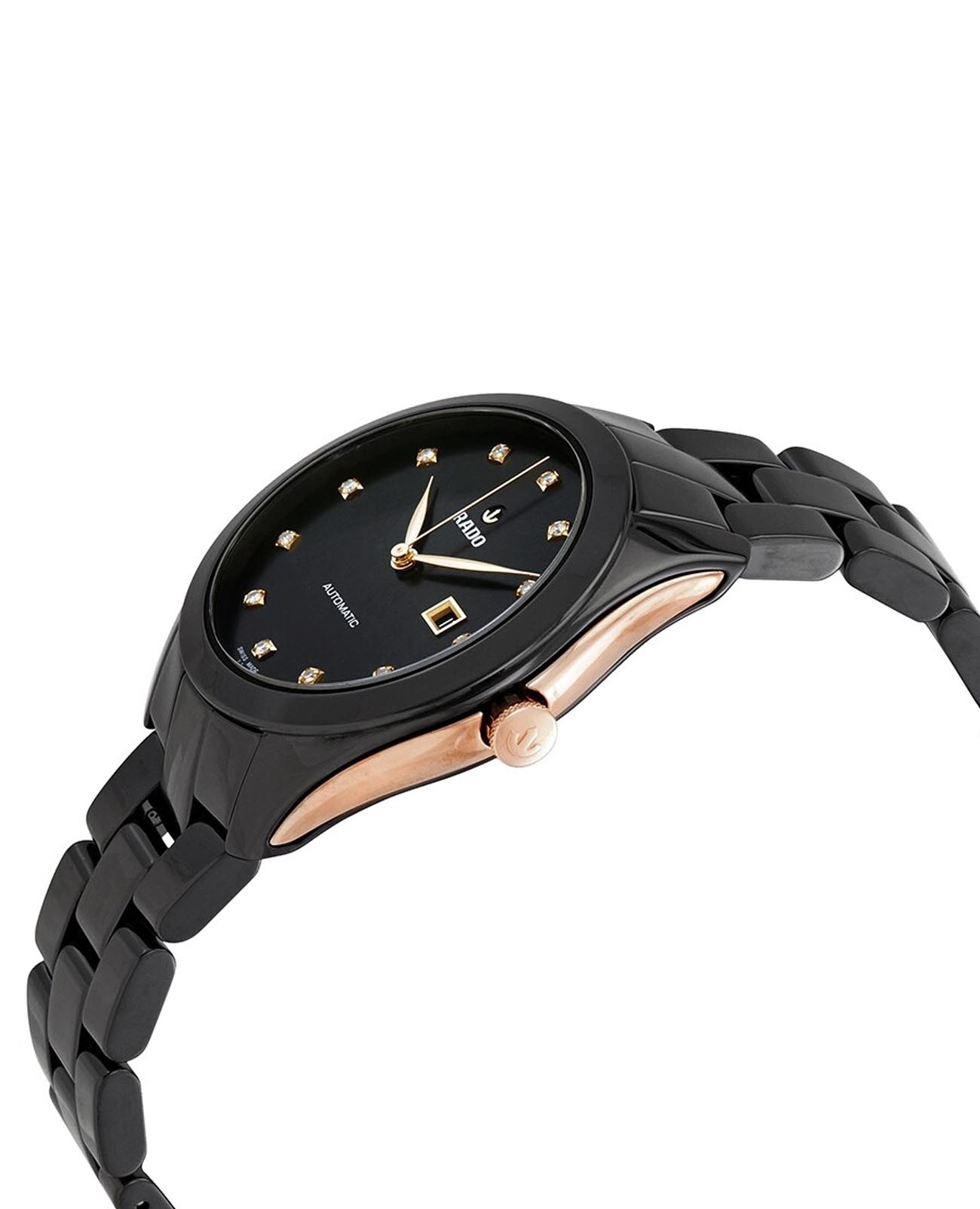 Женские механические швейцарские часы с автоподзаводом Rado Hyperchrome R32255712. Сапфировое стеклоСапфировое стеклоПрочный и надёжный материал из кристалла сапфира синтетического происхождения, характеризующийся особой твёрдостью и устойчивостью к царапинам и повреждениям. устойчивое к мелким механическим повреждениям. Корпус часов изготовлен из стали с PVD-покрытиемPVDУльтратонкое покрытие наносится в технике вакуумного напыления, сочетает в себе нитрид титана особой прочности со слоем золота или оксида хрома. Несёт в себе декоративную или защитную функцию. и высокотехнологичной керамикиВысокотехнологичная керамикаИнновационный запатентованный Rado материал с гладкой или матовой поверхностью. Керамика за счёт кристаллической структуры обладает повышенной устойчивостью от возникновения царапин. Материал способен принимать температуру тела человека, обеспечивая невероятный комфорт при ношении.. Окошко даты находится в положении 3 часа. Циферблат украшен бриллиантами. Класс водозащиты: 50 метров, позволит защитить корпус от случайных брызг или капель дождя. Браслет из высокотехнологичной керамикиВысокотехнологичная керамикаИнновационный запатентованный Rado материал с гладкой или матовой поверхностью. Керамика за счёт кристаллической структуры обладает повышенной устойчивостью от возникновения царапин. Материал способен принимать температуру тела человека, обеспечивая невероятный комфорт при ношении. на раскладной застёжкеРаскладная застёжкаТакой тип застёжки используется только на браслетах из металла. Она никогда не раскрывается полностью, происходит разделение на 2 и более частей. Раскладывающая застёжка снизит вероятность потери часов к минимуму..