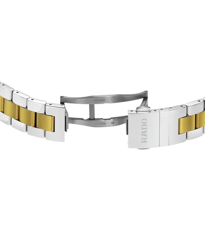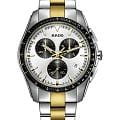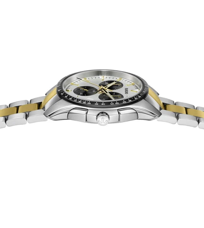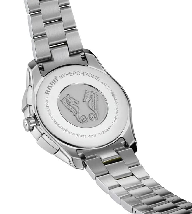 Мужские наручные часы-хронографХронографФункция позволяет измерять отрезки времени с особой точностью: часы, минуты, секунды. Верным признаком хронографа является наличие на циферблате 3 дополнительных окошек-счётчиков. Rado Hyperchrome Chronograph. Корпус часов изготовлен из нержавеющей стали. Стальной браслет с частичным PVD-покрытиемPVDУльтратонкое покрытие наносится в технике вакуумного напыления, сочетает в себе нитрид титана особой прочности со слоем золота или оксида хрома. Несёт в себе декоративную или защитную функцию. на застёжке «бабочка» с кнопкамиЗастёжка "бабочка"Такой вид застёжки дополняется предохранителями, помогающими избежать случайного раскрытия браслета. Обладают изящным исполнением. . БезельБезельВнешний ободок, закрепляющий стекло. В спортивных часах так называется поворотное кольцо с делениями на циферблате, выполняет роль таймера – замеряет отрезки времени на шкале. Неподвижный безель – элемент декора. Однонаправленно вращающийся безель на дайверских часах позволяет фиксировать моменты погружения и выныривания на поверхность. со шкалой тахиметраТахиметрРазмеченная шкала, располагается на ободке или безеле часов. Тахиметр позволяет рассчитать скорость на определённом участке пути, расстояние измеряется в километрах или милях.. Окошко даты находится в положении 4 часа. Стрелки и метки с люминесцентным покрытиемЛюминесцентное покрытиеПозволяет считывать показания времени в темноте. Производители наносят на стрелки, часовые индексы, безель или поверхность циферблата светонакопительный состав, дающий холодное свечение.. Сапфировое стеклоСапфировое стеклоПрочный и надёжный материал из кристалла сапфира синтетического происхождения, характеризующийся особой твёрдостью и устойчивостью к царапинам и повреждениям. с антибликовым покрытиемАнтибликовое покрытиеСлой оксида металла в 0,13-0,3 микрон, благодаря которому стекло часов не бликует и не отражает свет. Антибликовое покрытие уменьшает отражение света в 10 раз, обеспечивая отличную читаемость показателей циферблата. устойчивое к мелким механическим повреждениям. Класс водозащиты: 100 метров, позволит плавать, нырять и заниматься другими водными видами спорта.