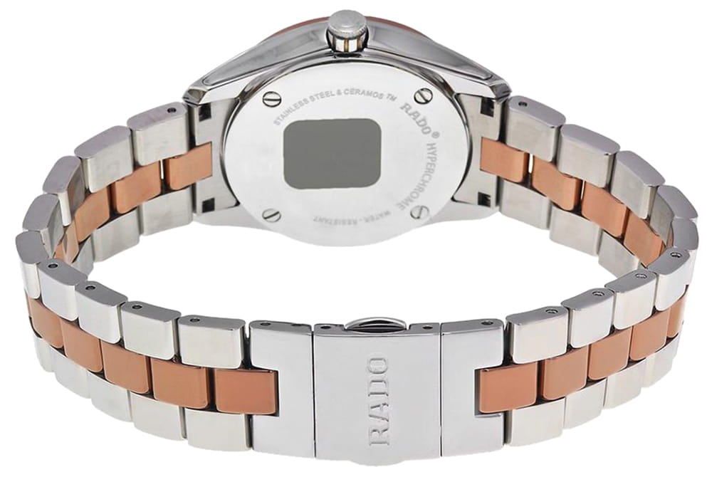 Женские швейцарские часы с надёжным кварцевым механизмом Rado Hyperchrome R32976102. Сапфировое стеклоСапфировое стеклоПрочный и надёжный материал из кристалла сапфира синтетического происхождения, характеризующийся особой твёрдостью и устойчивостью к царапинам и повреждениям. устойчивое к мелким механическим повреждениям. Корпус часов изготовлены из нержавеющей стали. Стальной браслет с CeramosCeramosМатериал являет собой инновационное сочетание высокотехнологичной керамики и сплава металла. Он объединяет керамическую устойчивость к царапинам и металлический роскошный блеск. на раскладной застёжкеРаскладная застёжкаТакой тип застёжки используется только на браслетах из металла. Она никогда не раскрывается полностью, происходит разделение на 2 и более частей. Раскладывающая застёжка снизит вероятность потери часов к минимуму.. Окошко даты находится в положении 3 часа. Стрелки с люминесцентным покрытиемЛюминесцентное покрытиеПозволяет считывать показания времени в темноте. Производители наносят на стрелки, часовые индексы, безель или поверхность циферблата светонакопительный состав, дающий холодное свечение.. Класс водозащиты: 50 метров, позволит защитить корпус от случайных брызг или капель дождя. БезельБезельВнешний ободок, закрепляющий стекло. В спортивных часах так называется поворотное кольцо с делениями на циферблате, выполняет роль таймера – замеряет отрезки времени на шкале. Неподвижный безель – элемент декора. Однонаправленно вращающийся безель на дайверских часах позволяет фиксировать моменты погружения и выныривания на поверхность. с CeramosCeramosМатериал являет собой инновационное сочетание высокотехнологичной керамики и сплава металла. Он объединяет керамическую устойчивость к царапинам и металлический роскошный блеск. .
