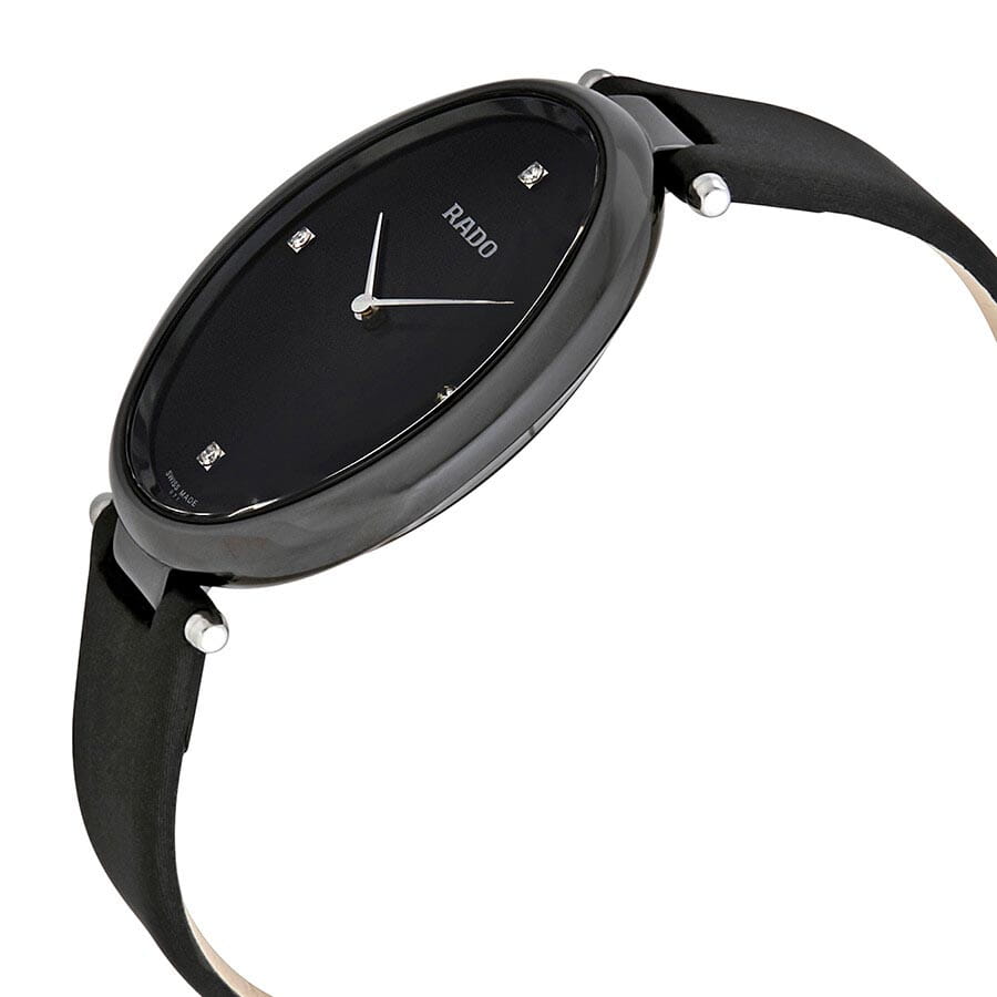 Женские керамические швейцарские часы с бриллиантами Rado Esenza R53093715, кварцевый механизм с высокой точностью. Сапфировое стеклоСапфировое стеклоПрочный и надёжный материал из кристалла сапфира синтетического происхождения, характеризующийся особой твёрдостью и устойчивостью к царапинам и повреждениям. устойчивое к появлению царапин, обладающее высокой прозрачностью. Класс водозащиты: 30 метров, позволит защитить корпус от случайных брызг или капель дождя. Корпус часов изготовлен из высокотехнологичной керамикиВысокотехнологичная керамикаИнновационный запатентованный Rado материал с гладкой или матовой поверхностью. Керамика за счёт кристаллической структуры обладает повышенной устойчивостью от возникновения царапин. Материал способен принимать температуру тела человека, обеспечивая невероятный комфорт при ношении.. Кожаный ремешок на стандартной застёжке.