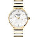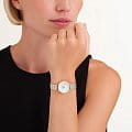 Перламутровый циферблат дополнен золотистыми стрелками и метками, что подчёркивает изысканный стиль модели. Браслет из нержавеющей стали с частичным PVD-покрытиемPVDУльтратонкое покрытие наносится в технике вакуумного напыления, сочетает в себе нитрид титана особой прочности со слоем золота или оксида хрома. Несёт в себе декоративную или защитную функцию. и раскладной застёжкойРаскладная застёжкаТакой тип застёжки используется только на браслетах из металла. Она никогда не раскрывается полностью, происходит разделение на 2 и более частей. Раскладывающая застёжка снизит вероятность потери часов к минимуму. обеспечивает комфортное ношение и долговечность.