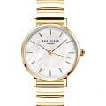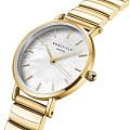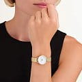 Перламутровый циферблат дополнен золотистыми стрелками и метками, что подчёркивает изысканный стиль модели. Браслет из нержавеющей стали с PVD-покрытиемPVDУльтратонкое покрытие наносится в технике вакуумного напыления, сочетает в себе нитрид титана особой прочности со слоем золота или оксида хрома. Несёт в себе декоративную или защитную функцию. и раскладной застёжкойРаскладная застёжкаТакой тип застёжки используется только на браслетах из металла. Она никогда не раскрывается полностью, происходит разделение на 2 и более частей. Раскладывающая застёжка снизит вероятность потери часов к минимуму. обеспечивает комфортное ношение и долговечность.