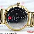 Корпус диаметром 26 мм выполнен из нержавеющей стали с PVD-покрытиемPVDУльтратонкое покрытие наносится в технике вакуумного напыления, сочетает в себе нитрид титана особой прочности со слоем золота или оксида хрома. Несёт в себе декоративную или защитную функцию. золотого цвета. Минеральное стекло защищает циферблат от царапин, сохраняя его безупречный вид.