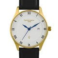 Стальной корпус круглой формы диаметром 38.2 мм и толщиной 9.2 мм выполнен из нержавеющей стали с частичным золотистым покрытием, что придает часам элегантный и премиальный вид. Циферблат белого цвета с римскими цифрами и метками в виде штрихов надежно защищен закаленным минеральным стекломМинеральное стеклоМинеральное стекло представляет собой искусственно выращенный минерал кварца. Такое стекло отличается особой устойчивостью к повреждениям и царапинам. Уступает по некоторым качествам сапфировому стеклу., что предотвращает появление царапин и повреждений.