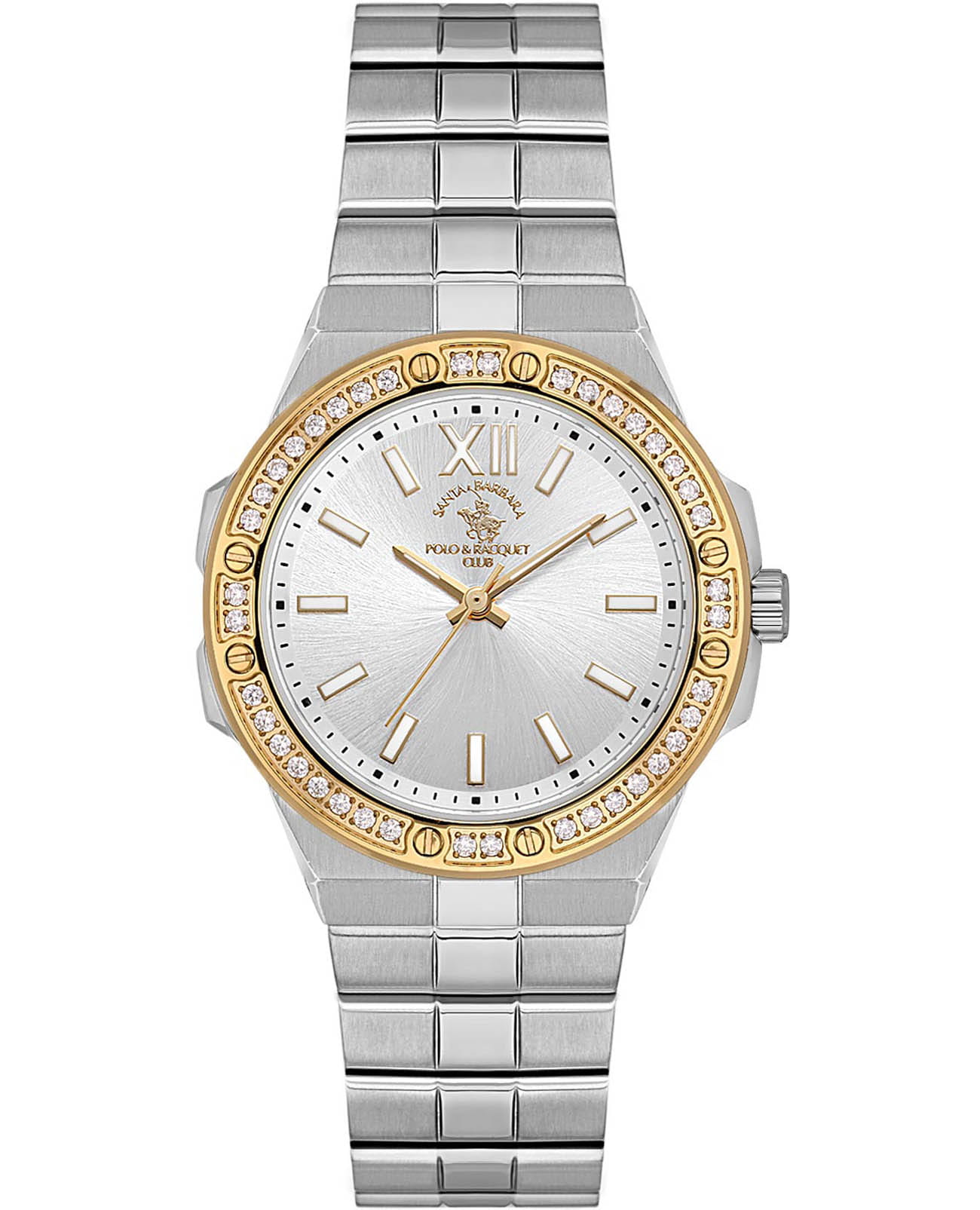 Женские кварцевые часы Santa Barbara Polo & Racquet Club Luxury SB.1.10575-4 — это стильный аксессуар, подчеркивающий индивидуальность. Изысканный корпус диаметром 32 мм выполнен из нержавеющей стали 316L с безелемБезельВнешний ободок, закрепляющий стекло. В спортивных часах так называется поворотное кольцо с делениями на циферблате, выполняет роль таймера – замеряет отрезки времени на шкале. Неподвижный безель – элемент декора. Однонаправленно вращающийся безель на дайверских часах позволяет фиксировать моменты погружения и выныривания на поверхность. с IP-покрытиемIP-покрытиеМетод ионного напыления. Демонстрирует повышенную устойчивость к истиранию, окислению и химическим веществам. Под воздействием высокого давления и температуры около 1500°C молекулы металла надёжно соединяются с частицами корпуса часов. и украшенным кристаллами. Изящный циферблат дополнен крупными накладными мтеками в виде штрихов и римской цифры XII, а также фирменным логотипом. Метки и стрелки в стиле Baton с люминесцентным покрытиемЛюминесцентное покрытиеПозволяет считывать показания времени в темноте. Производители наносят на стрелки, часовые индексы, безель или поверхность циферблата светонакопительный состав, дающий холодное свечение., обеспечивающим хорошую читаемость в темноте. Защиту циферблата обеспечивает минеральное стеклоМинеральное стеклоМинеральное стекло представляет собой искусственно выращенный минерал кварца. Такое стекло отличается особой устойчивостью к повреждениям и царапинам. Уступает по некоторым качествам сапфировому стеклу., устойчивое к мелким механическим повреждениям. Часы оснащены надежным стальным браслетом с застёжкой-бабочкаЗастёжка "бабочка"Такой вид застёжки дополняется предохранителями, помогающими избежать случайного раскрытия браслета. Обладают изящным исполнением. , обеспечивающая комфортное и безопасное ношение. Водонепроницаемость 50 м позволяет использовать часы в повседневных условиях. Идеальный выбор для тех, кто ценит элегантный дизайн и качество.