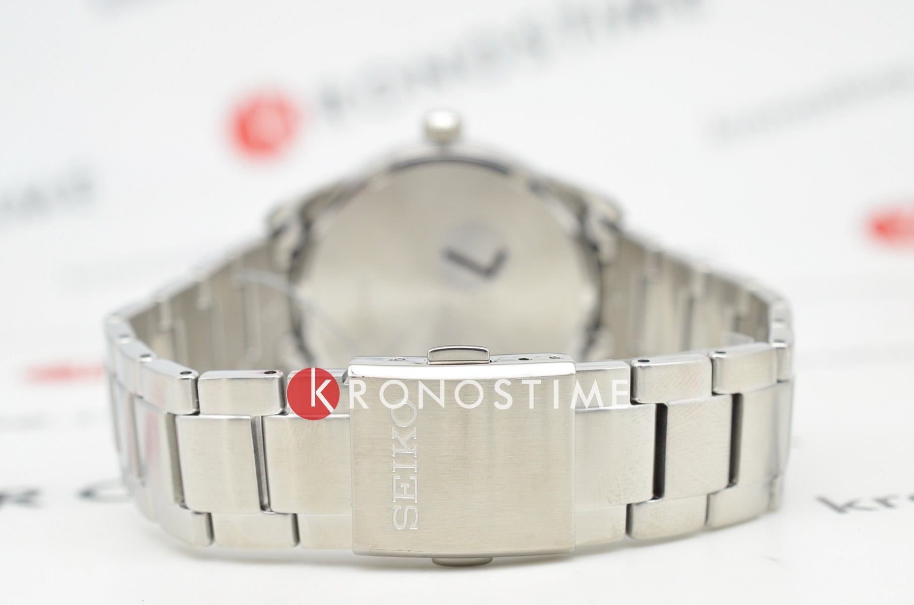 Seiko SNE525P1 — стильные мужские часы из коллекции Conceptual Series Dress, выполненные в универсальном классическом дизайне с современным акцентом. Корпус диаметром 41 мм изготовлен из нержавеющей стали с аккуратной сатинированной отделкой, а прочный браслет из того же материала дополнен раскладной застёжкойРаскладная застёжкаТакой тип застёжки используется только на браслетах из металла. Она никогда не раскрывается полностью, происходит разделение на 2 и более частей. Раскладывающая застёжка снизит вероятность потери часов к минимуму., обеспечивающей комфортное и надёжное ношение. В качестве защитного элемента используется минеральное стеклоМинеральное стеклоМинеральное стекло представляет собой искусственно выращенный минерал кварца. Такое стекло отличается особой устойчивостью к повреждениям и царапинам. Уступает по некоторым качествам сапфировому стеклу. Hardlex, обладающее повышенной устойчивостью к повреждениям. Модель оснащена солнечным модулем Tough SolarTough SolarТехнология основана на подзарядке аккумулятора от источника солнечного света, специальная панель улавливает солнечные лучи и преобразует их в энергию для работы часов. Достаточно пары минут нахождения на солнце для функционирования часов в течении суток., аккумулирующим энергию света и обеспечивающим длительную автономную работу без замены батарейки. Циферблат глубокого синего цвета подчёркивает деловой стиль часов и дополнен индикатором даты и дня недели на «3 часах». Тонкие стрелки и метки покрыты люминесцентным покрытиемЛюминесцентное покрытиеПозволяет считывать показания времени в темноте. Производители наносят на стрелки, часовые индексы, безель или поверхность циферблата светонакопительный состав, дающий холодное свечение., что делает показания легко читаемыми даже при слабом освещении. Водозащита до 100 метров позволяет использовать часы в повседневных условиях и при кратковременном контакте с водой.
