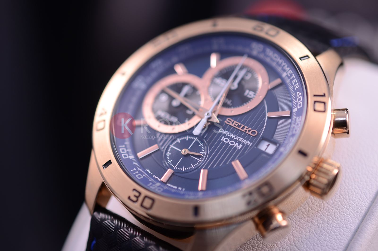 Успешные люди, желающие идти в ногу со временем, выбирают инновационные и надежные часы марки Seiko. Кварцевый механизм, калибр Seiko  8T67. Корпус круглой формы выполнен из высокопрочной стали с антикоррозийными свойствами с PVD покрытием. Синий фон циферблата с позолоченными элементами дизайна. Часы снабжены минеральным стеклом, устойчивым к царапинам. Водонепроницаемость до 100 метров. Часы прочно удерживаются на руке ремешком из натуральной кожи синего цвета. Часы оснащены хронографом и тахиметром.
