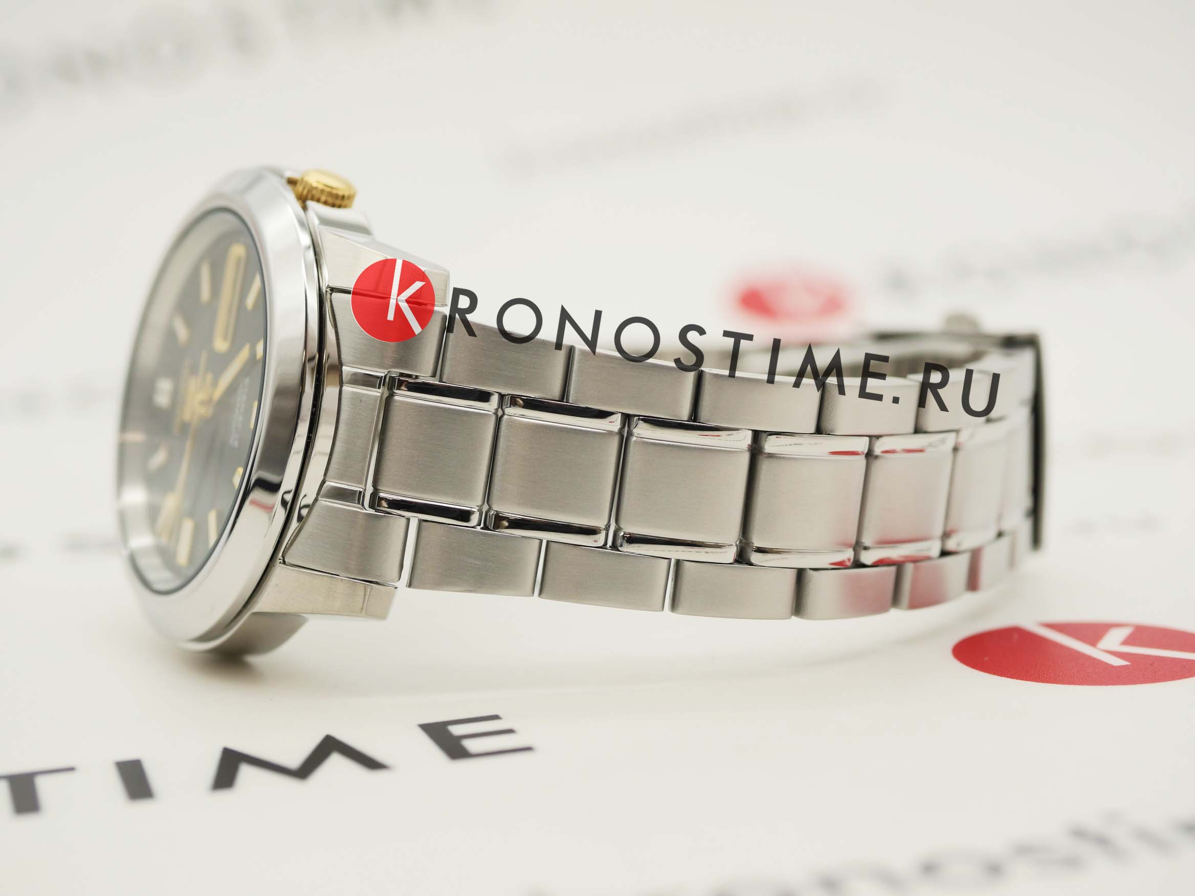 Наручные часы выполнены в классическом стиле, спортивные элементы делают акцент на надёжности и функциональности модели. Традиционный характер выражается в оснащении аксессуара японским механизмом Seiko 7S26 с возможностью ручного и автоматического завода. Калибр отличается сохранением запаса хода на 40 часов, его работу можно отследить через прозрачную завинчивающуюся заднюю крышку. В качестве основного материала была выбрана хирургическая сталь 316L, характеризующаяся устойчивостью к царапинам, повреждениям. Защиту циферблата обеспечивает прочное минеральное стеклоМинеральное стеклоМинеральное стекло представляет собой искусственно выращенный минерал кварца. Такое стекло отличается особой устойчивостью к повреждениям и царапинам. Уступает по некоторым качествам сапфировому стеклу. Hardlex. На стрелки нанесено люминесцентное покрытиеЛюминесцентное покрытиеПозволяет считывать показания времени в темноте. Производители наносят на стрелки, часовые индексы, безель или поверхность циферблата светонакопительный состав, дающий холодное свечение.. Водостойкость при давлении до 3 бар. На позиции 3 часов размещено окошко даты и дня недели. Диаметр корпуса: 38 мм.