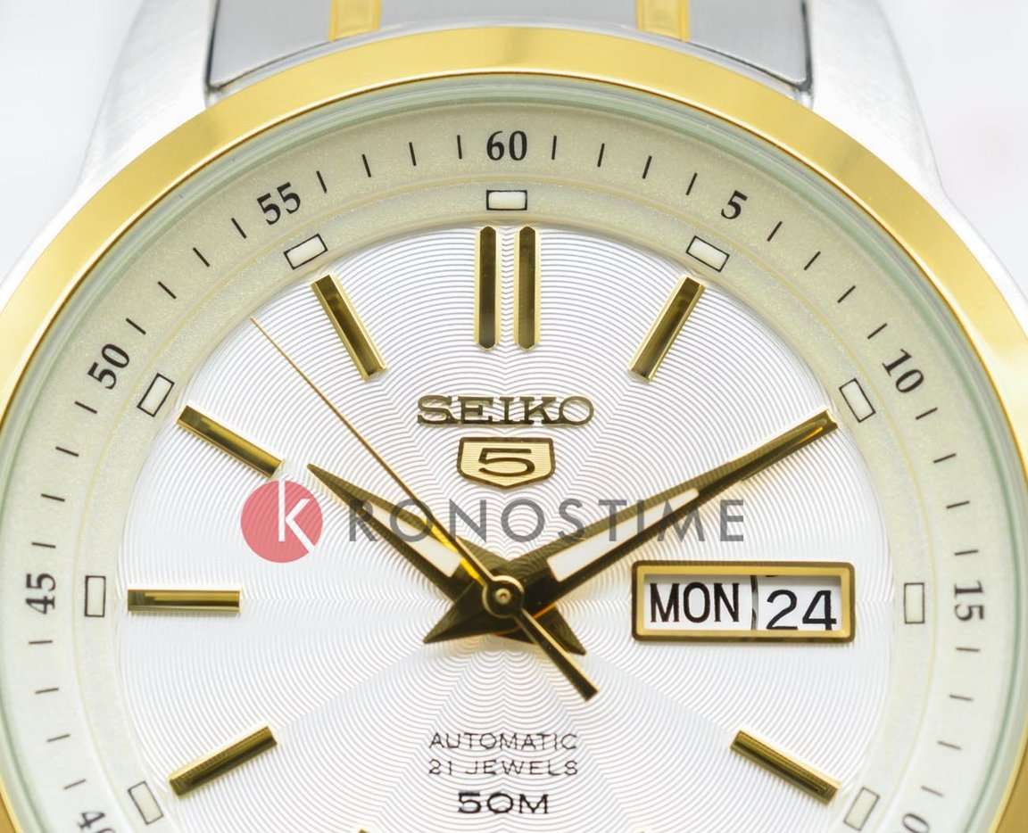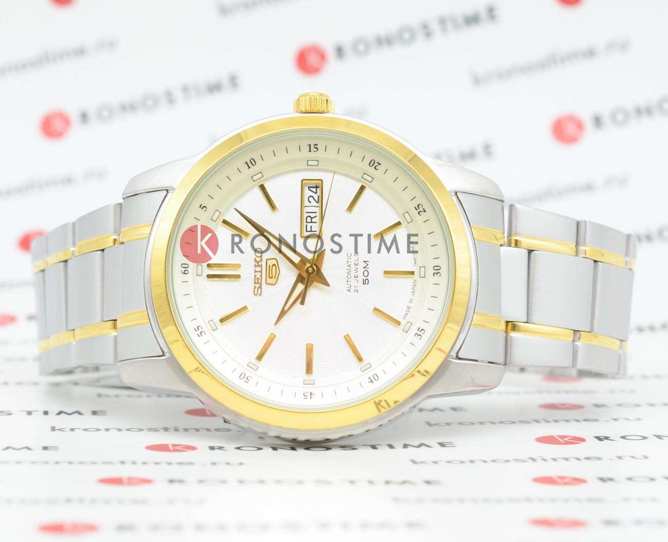 Элегантный аксессуар в биколорном исполнении стильно смотрится на широком мужском запястье, выгодно подчёркивая ваш тонкий вкус. БезельБезельВнешний ободок, закрепляющий стекло. В спортивных часах так называется поворотное кольцо с делениями на циферблате, выполняет роль таймера – замеряет отрезки времени на шкале. Неподвижный безель – элемент декора. Однонаправленно вращающийся безель на дайверских часах позволяет фиксировать моменты погружения и выныривания на поверхность. с PVD-покрытиемPVDУльтратонкое покрытие наносится в технике вакуумного напыления, сочетает в себе нитрид титана особой прочности со слоем золота или оксида хрома. Несёт в себе декоративную или защитную функцию.. Светлый циферблат с золотистыми стрелками и метками обеспечивает идеальную читаемость данных, он защищён минеральным стекломМинеральное стеклоМинеральное стекло представляет собой искусственно выращенный минерал кварца. Такое стекло отличается особой устойчивостью к повреждениям и царапинам. Уступает по некоторым качествам сапфировому стеклу. Hardlex с закаленной поверхностью. Абсолютная точность хода достигается благодаря автоматическому японскому механизму 7S26, запас хода которого рассчитан на 40 часов. Прозрачная задняя крышка позволяет наблюдать за движением деталей калибра. Часы устойчивы к воздействию магнитного поля, прочные корпус и браслет сделаны из стали 316L с частичным PVD-покрытиемPVDУльтратонкое покрытие наносится в технике вакуумного напыления, сочетает в себе нитрид титана особой прочности со слоем золота или оксида хрома. Несёт в себе декоративную или защитную функцию.. Стрелки имеют люминесцентную подсветкуЛюминесцентное покрытиеПозволяет считывать показания времени в темноте. Производители наносят на стрелки, часовые индексы, безель или поверхность циферблата светонакопительный состав, дающий холодное свечение.. На метке 3 часов размещена апертура даты, отображается текущее число и день недели. Диаметр корпуса: 43 мм.