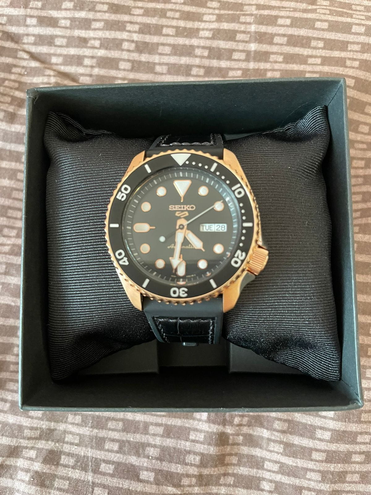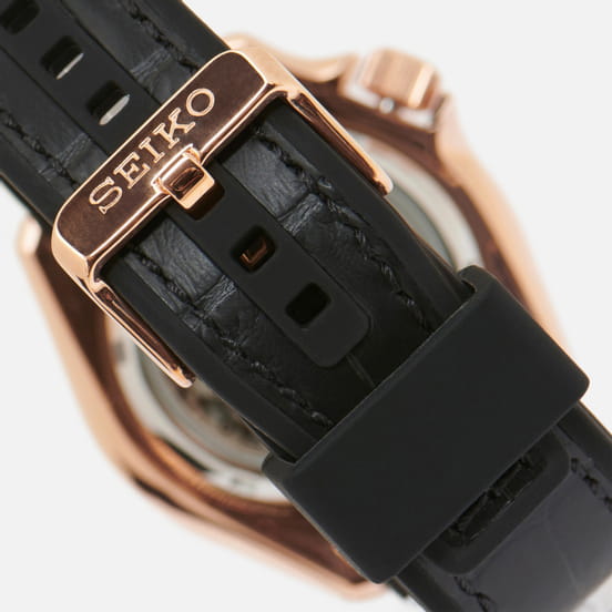 Часы Seiko 5 Sports SRPD76K1 сочетают в себе элегантный дизайн и надёжность, характерные для японского часового мастерства. Корпус диаметром 42,5 мм выполнен из нержавеющей стали с PVD-покрытиемPVDУльтратонкое покрытие наносится в технике вакуумного напыления, сочетает в себе нитрид титана особой прочности со слоем золота или оксида хрома. Несёт в себе декоративную или защитную функцию. розового золота, придающим часам утончённый вид. Чёрный циферблат защищён минеральным стекломМинеральное стеклоМинеральное стекло представляет собой искусственно выращенный минерал кварца. Такое стекло отличается особой устойчивостью к повреждениям и царапинам. Уступает по некоторым качествам сапфировому стеклу. с повышенной прочностью.