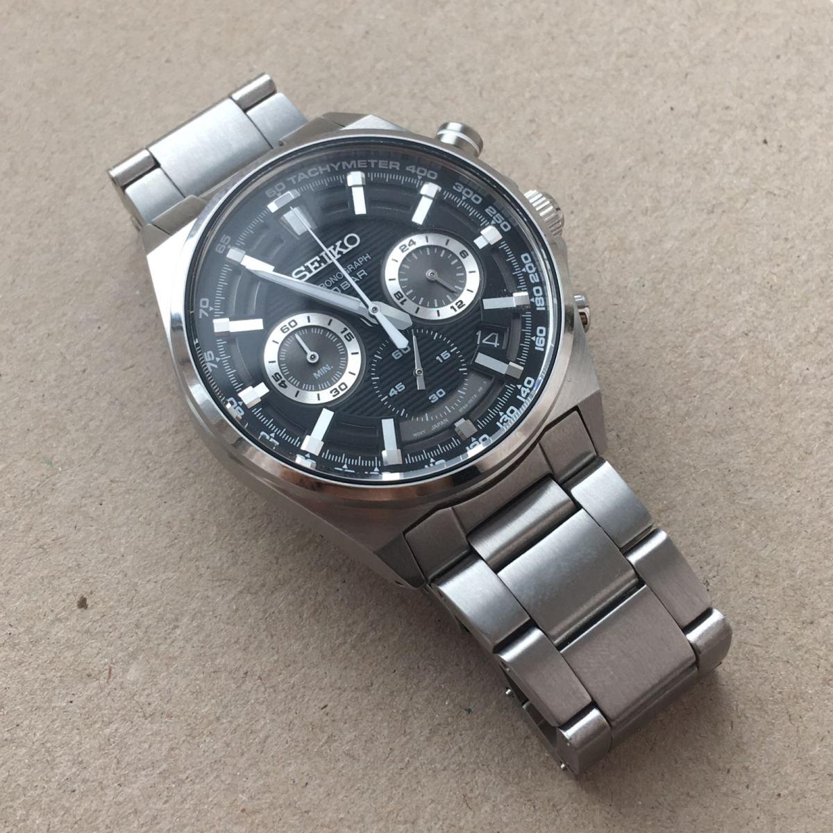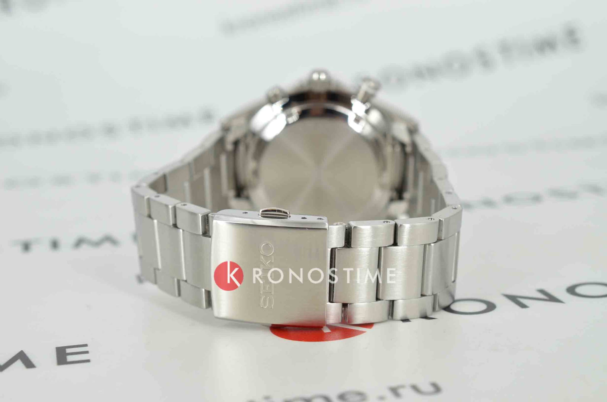 Часы оснащены кварцевым механизмом Seiko калибра 8T63 с точностью ±15 секунд в месяц и функцией хронографа до 60 минут с точностью 1/5 секунды.  Циферблат защищён минеральным стекломМинеральное стеклоМинеральное стекло представляет собой искусственно выращенный минерал кварца. Такое стекло отличается особой устойчивостью к повреждениям и царапинам. Уступает по некоторым качествам сапфировому стеклу. Hardlex, устойчивым к царапинам.  Установлена раскладная застёжкаРаскладная застёжкаТакой тип застёжки используется только на браслетах из металла. Она никогда не раскрывается полностью, происходит разделение на 2 и более частей. Раскладывающая застёжка снизит вероятность потери часов к минимуму. с тройным сгибом и кнопкой освобождения.  Модель обладает водонепроницаемостью до 100 метров, что делает её подходящей для плавания и сноркелинга.
