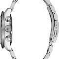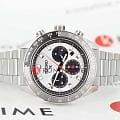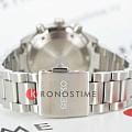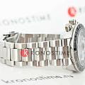 Фиксированный алюминиевый тахиметрический безельТахиметрРазмеченная шкала, располагается на ободке или безеле часов. Тахиметр позволяет рассчитать скорость на определённом участке пути, расстояние измеряется в километрах или милях. позволяет измерять скорость по пройденному расстоянию. Серебристый, солнечного финиша циферблат украшен тремя чёрными счётчиками: малого секундомерного, хронографа и 24-часового. Стрелки хронографа — красные, для удобства считывания, а часовые метки и стрелки покрыты люминесцентным покрытиемЛюминесцентное покрытиеПозволяет считывать показания времени в темноте. Производители наносят на стрелки, часовые индексы, безель или поверхность циферблата светонакопительный состав, дающий холодное свечение. LumiBrite, что обеспечивает отличную видимость в условиях слабого света.