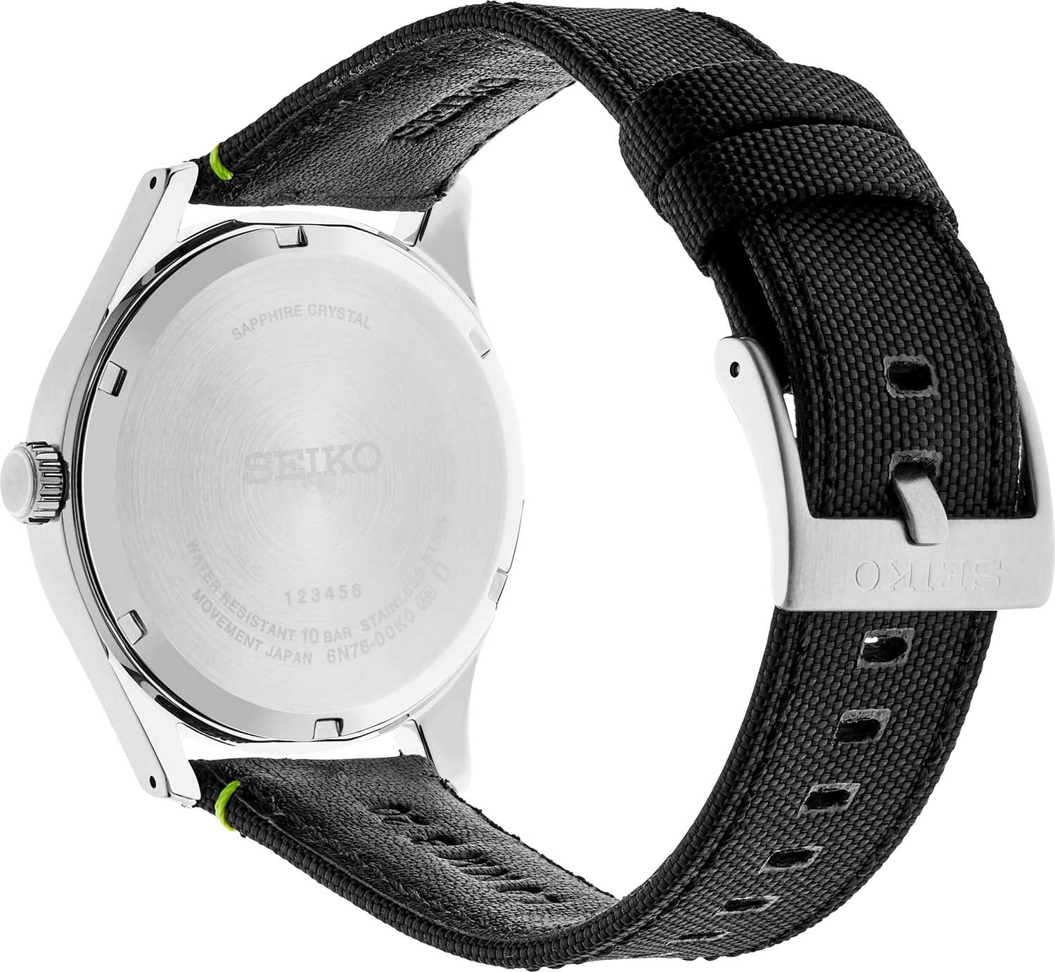 Мужские японские часы Seiko Discover More SUR517P1 c кварцевым механизмом с высокой точностью с калибром 6N76. Сапфировое стеклоСапфировое стеклоПрочный и надёжный материал из кристалла сапфира синтетического происхождения, характеризующийся особой твёрдостью и устойчивостью к царапинам и повреждениям., устойчивое к появлению царапин, обладающее высокой прозрачностью. Класс водозащиты: 100 метров, позволит плавать, нырять и заниматься другими водными видами спорта. Корпус из стали, а браслет изготовлен из нейлона. Стрелки и метки с люминесцентным покрытиемЛюминесцентное покрытиеПозволяет считывать показания времени в темноте. Производители наносят на стрелки, часовые индексы, безель или поверхность циферблата светонакопительный состав, дающий холодное свечение. LumiBrite. Ремешок со стандартной застежкой. Окошко даты находится в положении 6 часов.