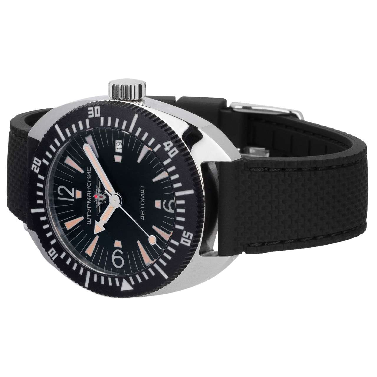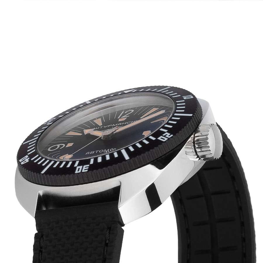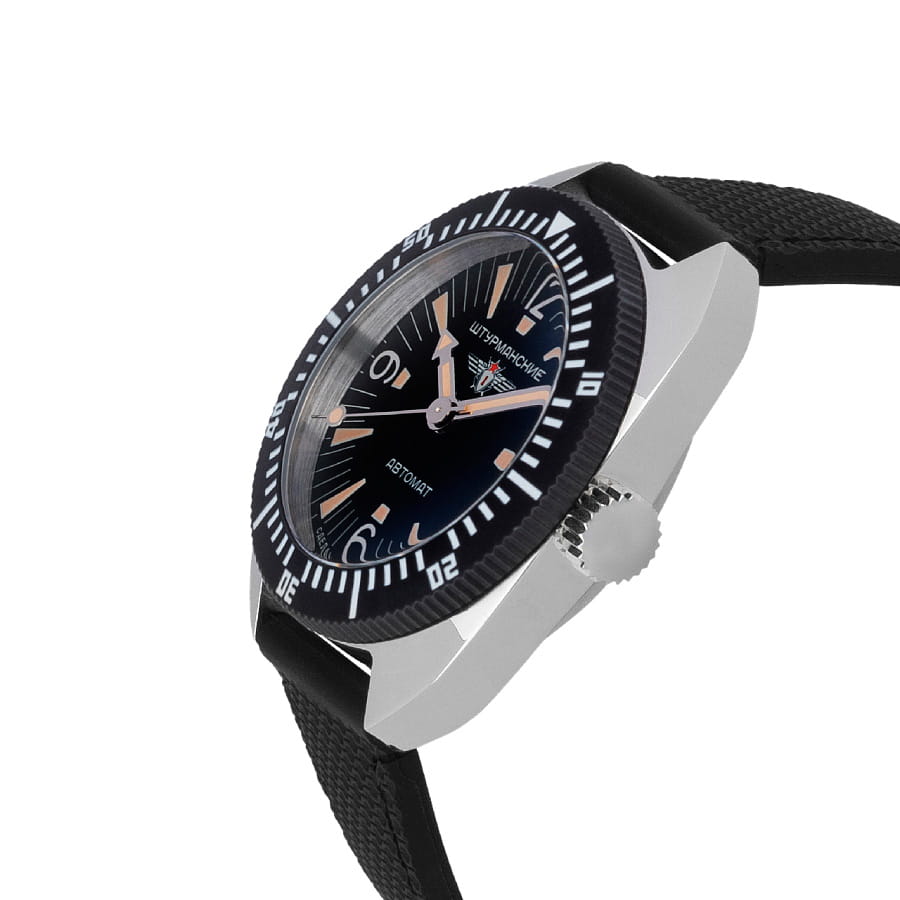 Мужские механические часы с автоподзаводом Штурманские Амфибия 2416/8881503 с высокой точностью. Корпус из нержавеющей стали диаметром 42 мм идеально сбалансирован и элегантен. Минеральное стеклоМинеральное стеклоМинеральное стекло представляет собой искусственно выращенный минерал кварца. Такое стекло отличается особой устойчивостью к повреждениям и царапинам. Уступает по некоторым качествам сапфировому стеклу. устойчивое к мелким механическим повреждениям. Силиконовый ремешок на стандартной застёжке, обеспечивает комфортное ношение. Класс водозащиты: 200 метров, позволит плавать, нырять и заниматься другими водными видами спорта. Стрелки и метки на циферблате имеют люминесцентное покрытиеЛюминесцентное покрытиеПозволяет считывать показания времени в темноте. Производители наносят на стрелки, часовые индексы, безель или поверхность циферблата светонакопительный состав, дающий холодное свечение. позволяющее легко определять время даже в темноте. Окошко даты находится в положении 3 часа. Рифленая заводная головка. БезельБезельВнешний ободок, закрепляющий стекло. В спортивных часах так называется поворотное кольцо с делениями на циферблате, выполняет роль таймера – замеряет отрезки времени на шкале. Неподвижный безель – элемент декора. Однонаправленно вращающийся безель на дайверских часах позволяет фиксировать моменты погружения и выныривания на поверхность. с PVD-покрытиемPVDУльтратонкое покрытие наносится в технике вакуумного напыления, сочетает в себе нитрид титана особой прочности со слоем золота или оксида хрома. Несёт в себе декоративную или защитную функцию. и минутной шкалой поворачивается в одном направлении.