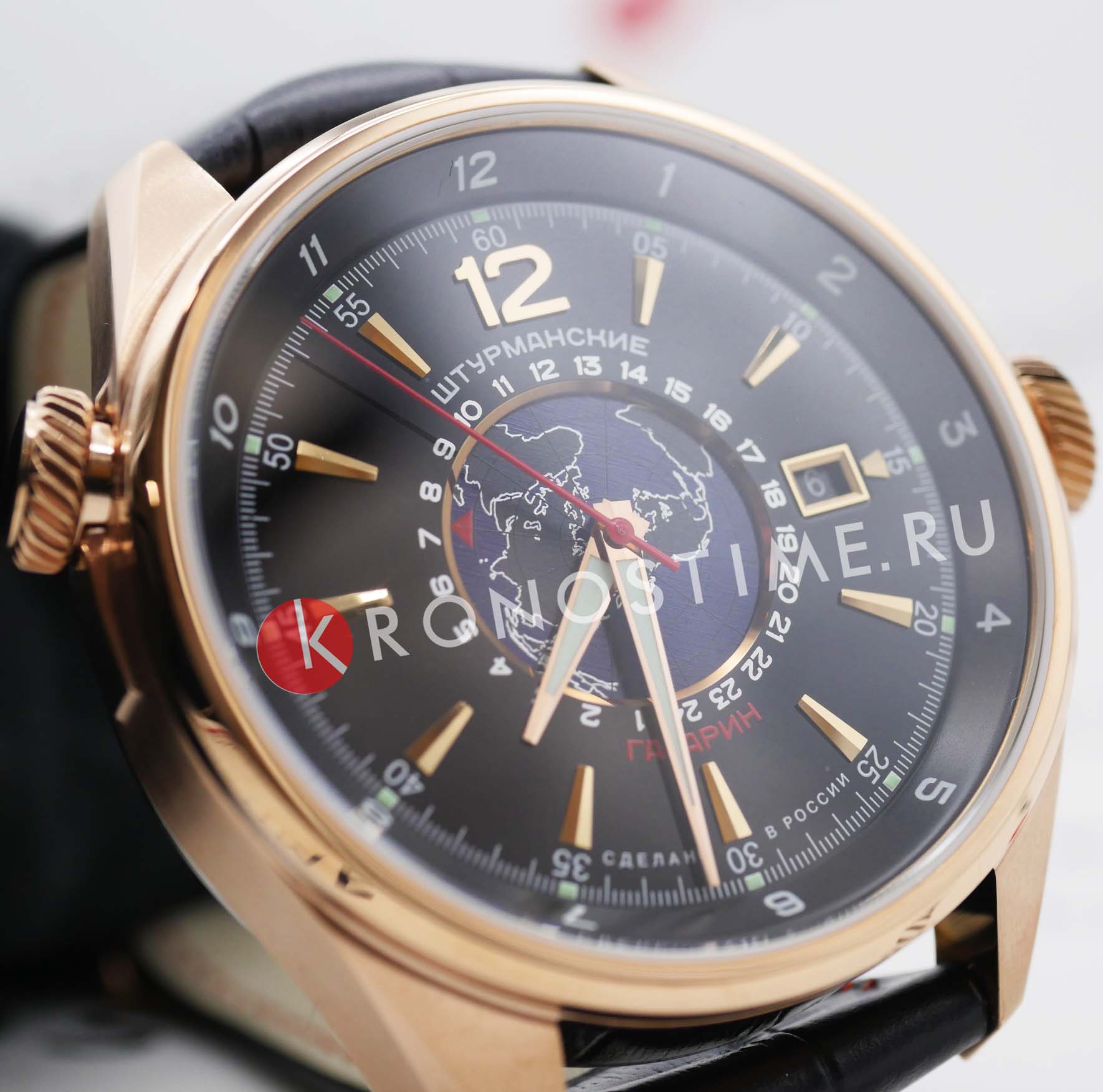 Штурманские мужские российские механические часы с 24-часовым форматом времени Штурманские Гагарин День-Ночь 2432/4579794, механический механизм (автоматический калибр) с высокой точностью. Класс водозащиты: 100 метров, позволит плавать, нырять и заниматься другими водными видами спорта. Корпус часов изготовлен из стали с PVD-покрытиемPVDУльтратонкое покрытие наносится в технике вакуумного напыления, сочетает в себе нитрид титана особой прочности со слоем золота или оксида хрома. Несёт в себе декоративную или защитную функцию.. Кожаный ремешок на стандартной застёжке. Окошко даты находится в положении 3 часа. Стрелки и метки с люминесцентным покрытиемЛюминесцентное покрытиеПозволяет считывать показания времени в темноте. Производители наносят на стрелки, часовые индексы, безель или поверхность циферблата светонакопительный состав, дающий холодное свечение.. Часы могут похвастаться второй часовой зоной и календарным диском. Внутри надежного стального корпуса размещен надежный механизм с автоматическим подзаводом.