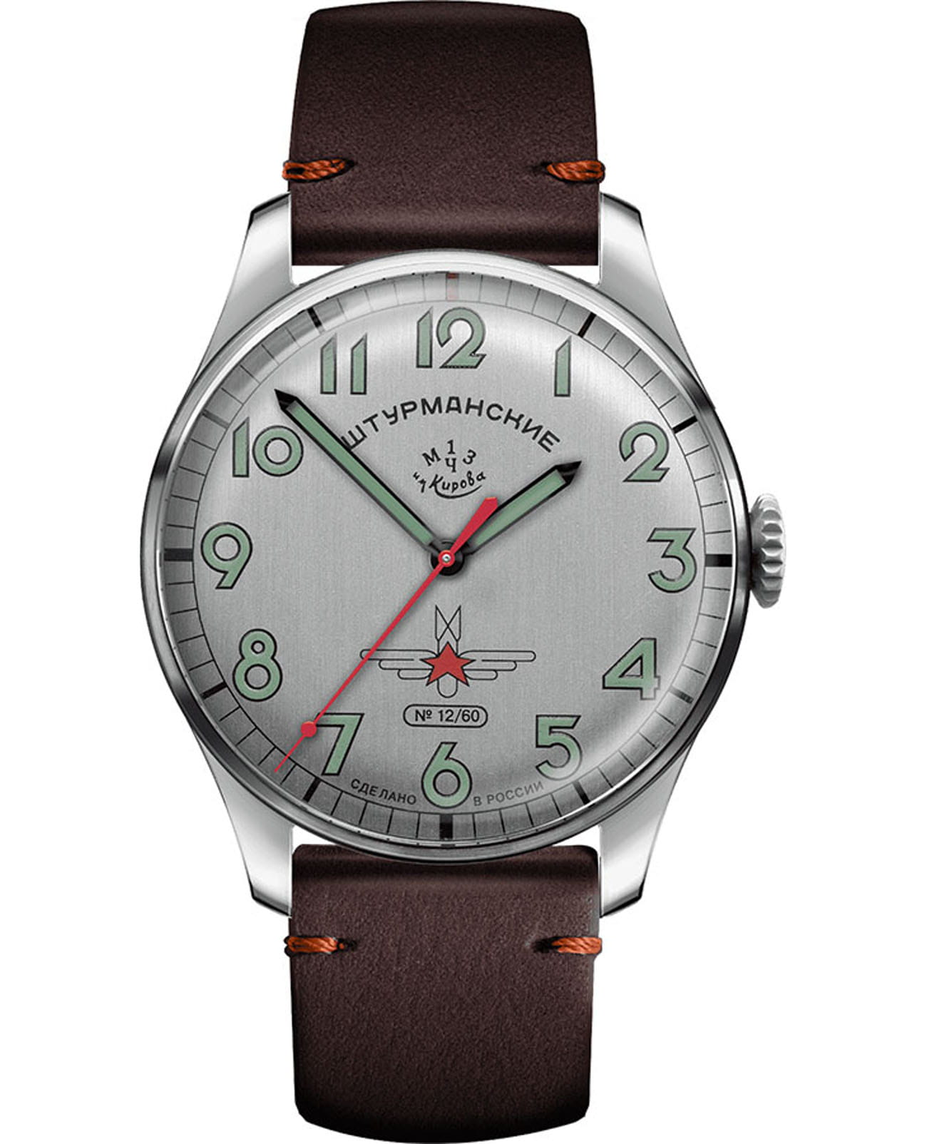 Мужские российские механические часы Штурманские Гагарин Наследие 2609/3787960, механический механизм (автоматический калибр) с высокой точностью. Сапфировое стеклоСапфировое стеклоПрочный и надёжный материал из кристалла сапфира синтетического происхождения, характеризующийся особой твёрдостью и устойчивостью к царапинам и повреждениям. устойчивое к мелким механическим повреждениям. Класс водозащиты: 50 метров, позволит защитить корпус от случайных брызг или капель дождя. Корпус часов изготовлен из титана. Кожаный ремешок на стандартной застёжке. Стрелки и метки с люминесцентным покрытиемЛюминесцентное покрытиеПозволяет считывать показания времени в темноте. Производители наносят на стрелки, часовые индексы, безель или поверхность циферблата светонакопительный состав, дающий холодное свечение.. Чёткая, читаемая минутная шкала уходит за приделы видимой области циферблата, подчёркивая изящность ободка корпуса. Оцифровка циферблата – отличительная особенность данной модели, её дизайн не изменился с самой первый, гагаринской серии. Заводная головка конической формы с удобной насечкой повторяет дизайн оригинальной модели. Лимитированная серия: 60 шт.